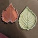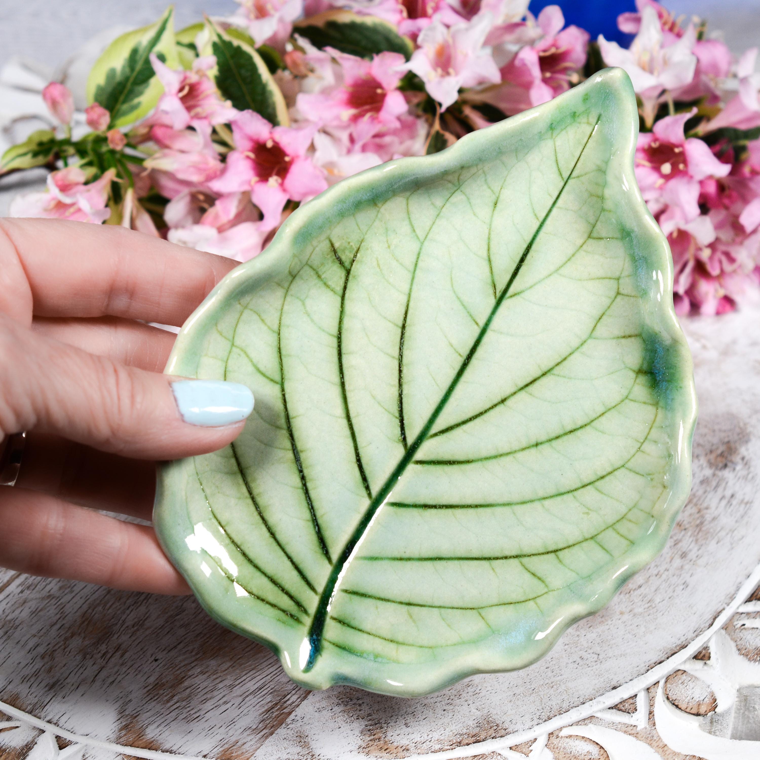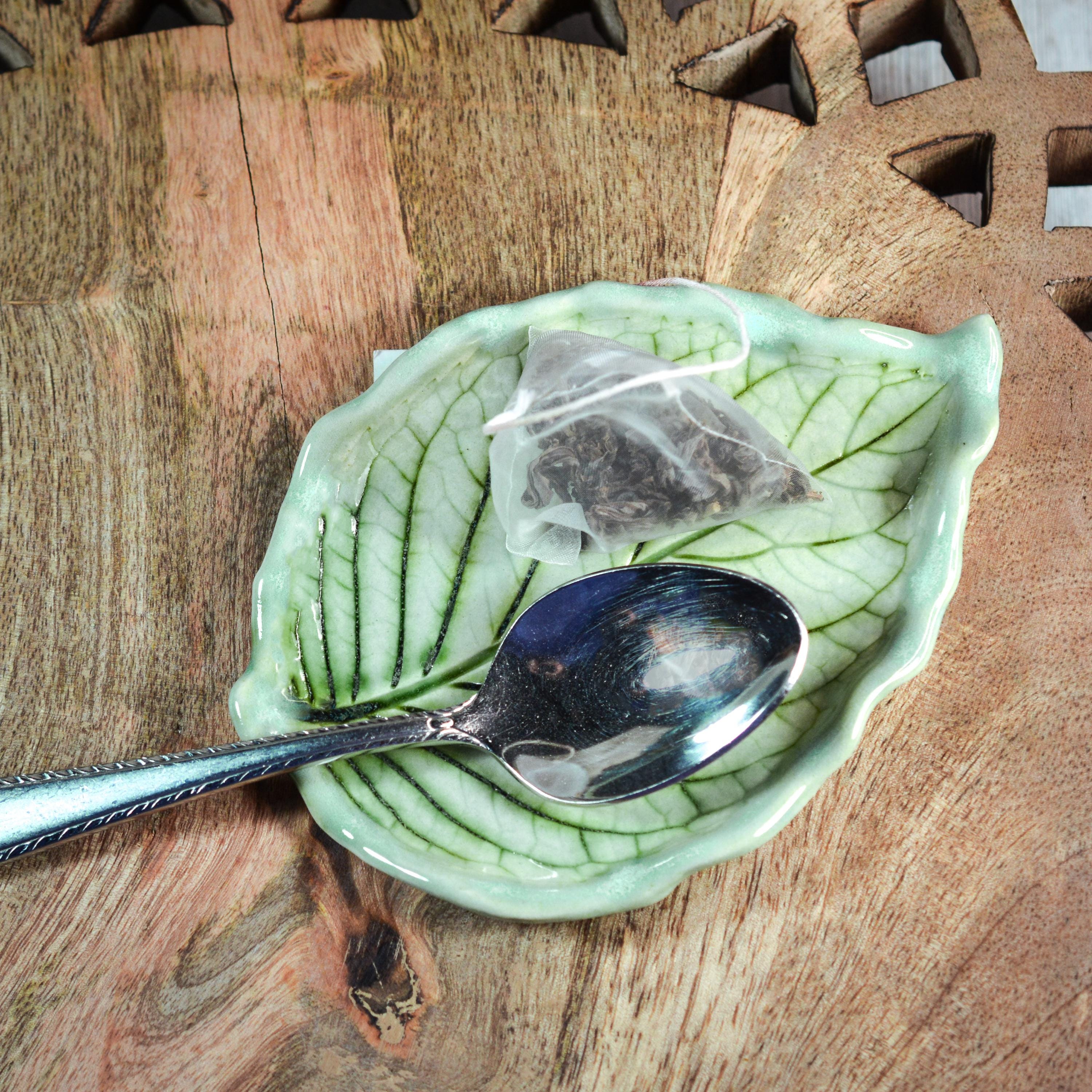 A ceramic leaf, hand painted with layers of soft minty green glaze. Veins are glazed in dark green. A decorative piece, or functional as a spoon rest, tea bag rest, jewelry dish and more.