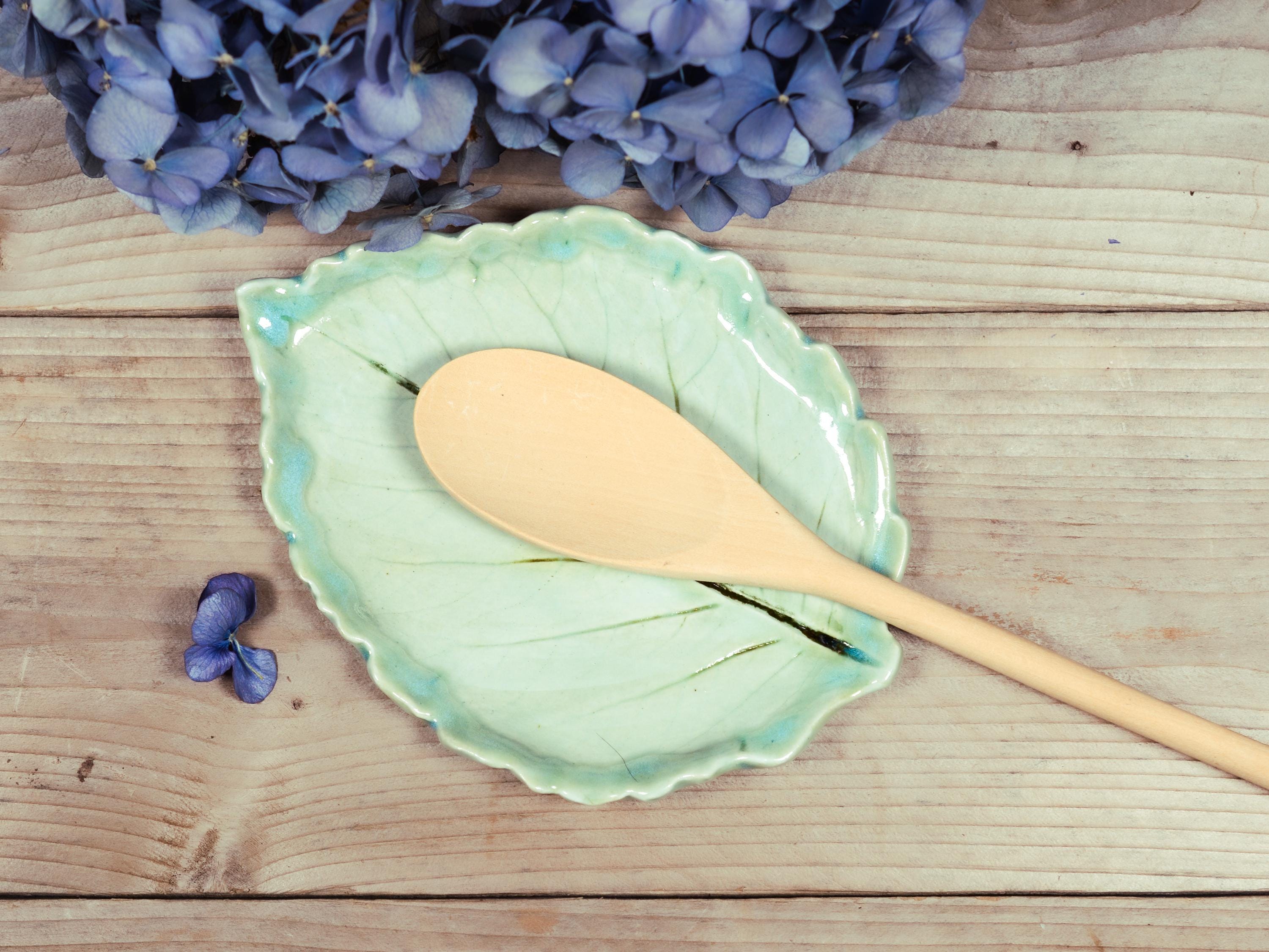 A large dahlia leaf, designed to be a spoon rest, but would also make a unique snack/appetizer plate. Glazed with layers of soft, light aqua blue glazes.