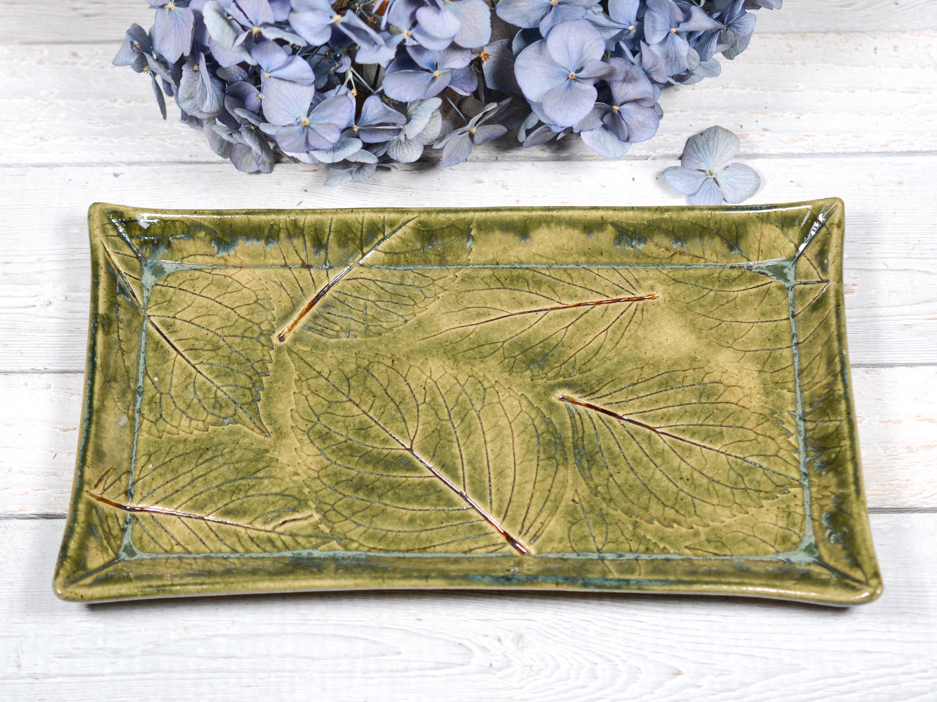 HANDMADE with Washington clay and food safe glazes from hydrangea leaves out of my garden. Placement of leaves vary on each tray, no two are exactly the same.