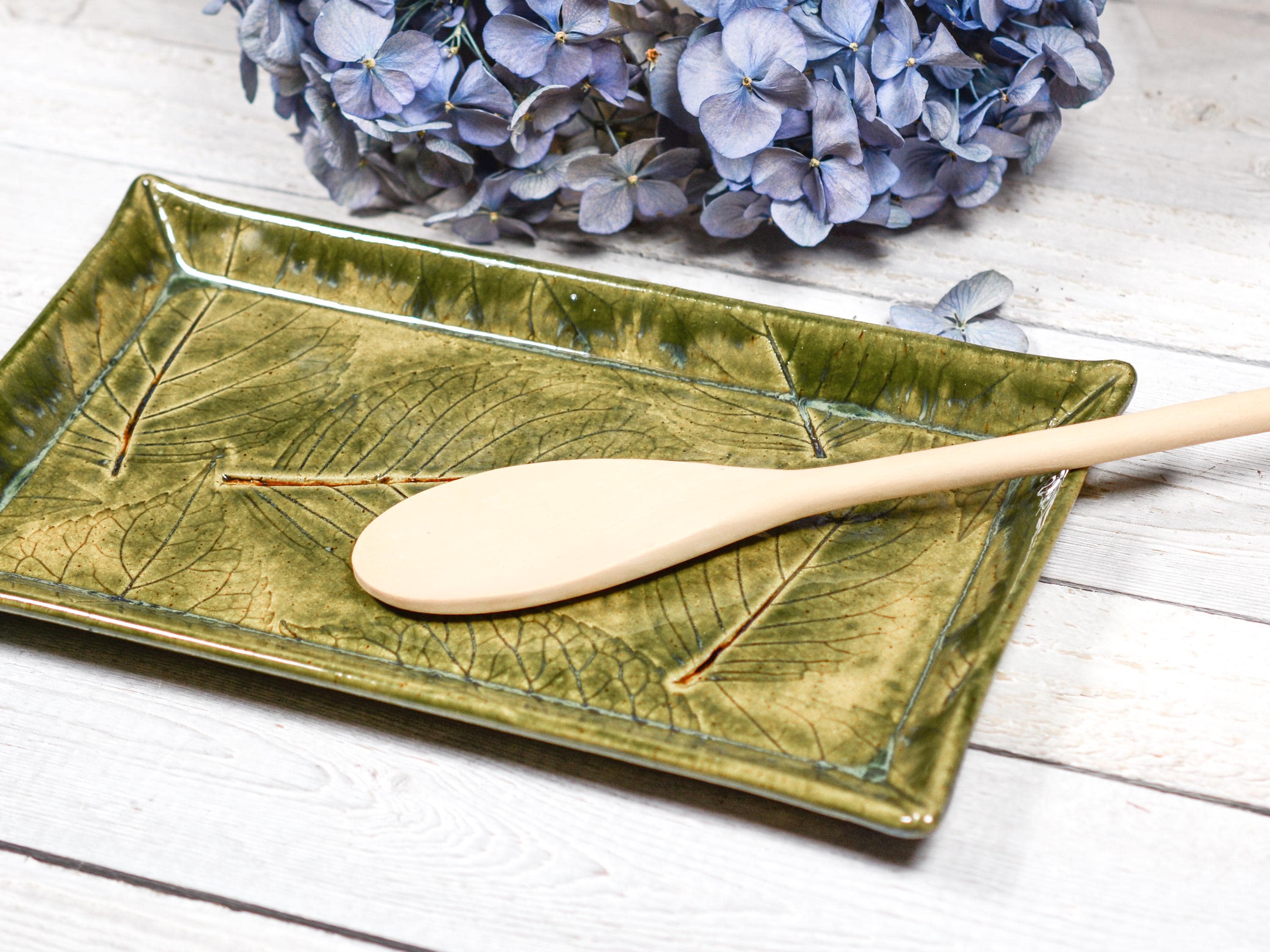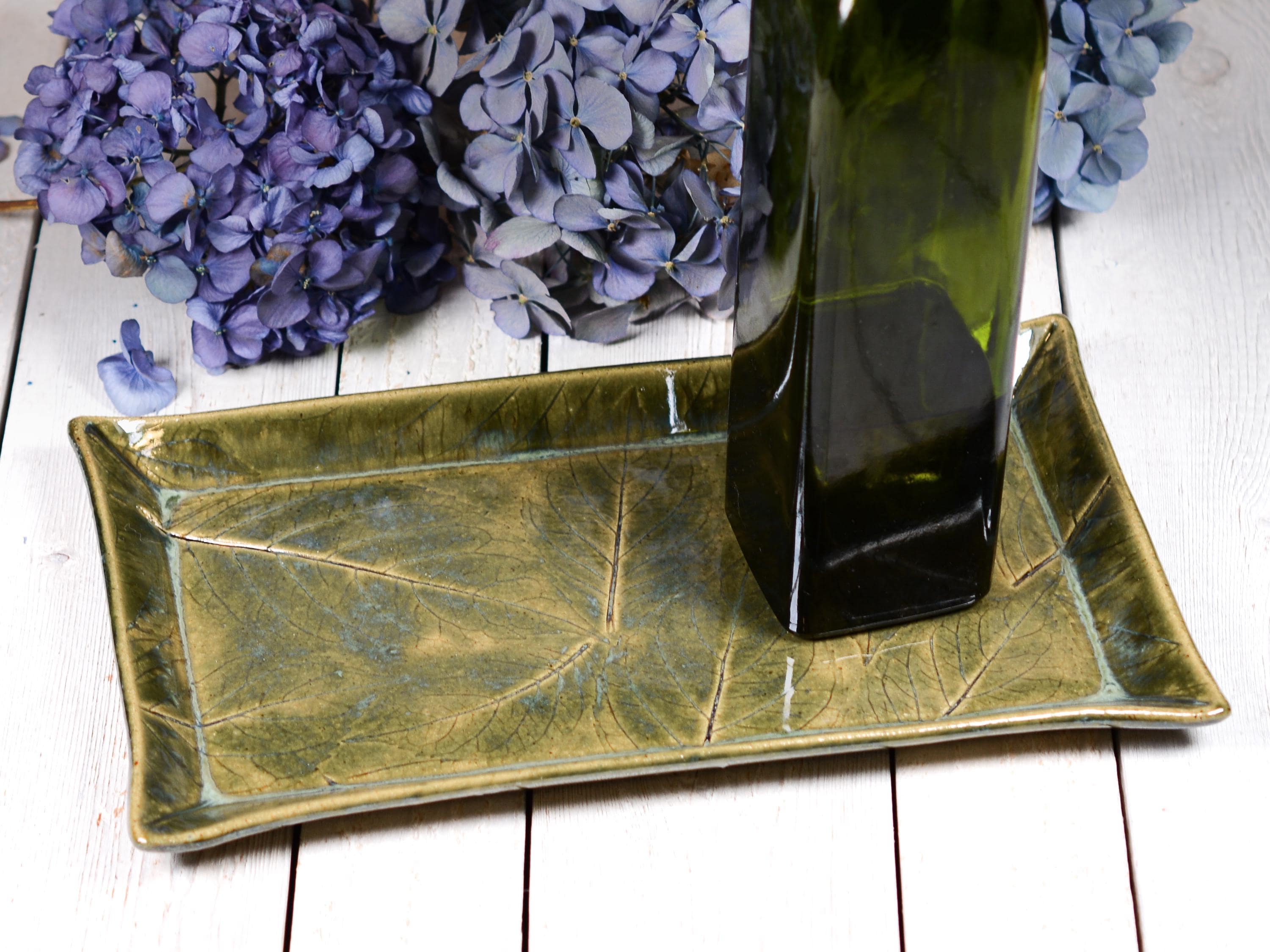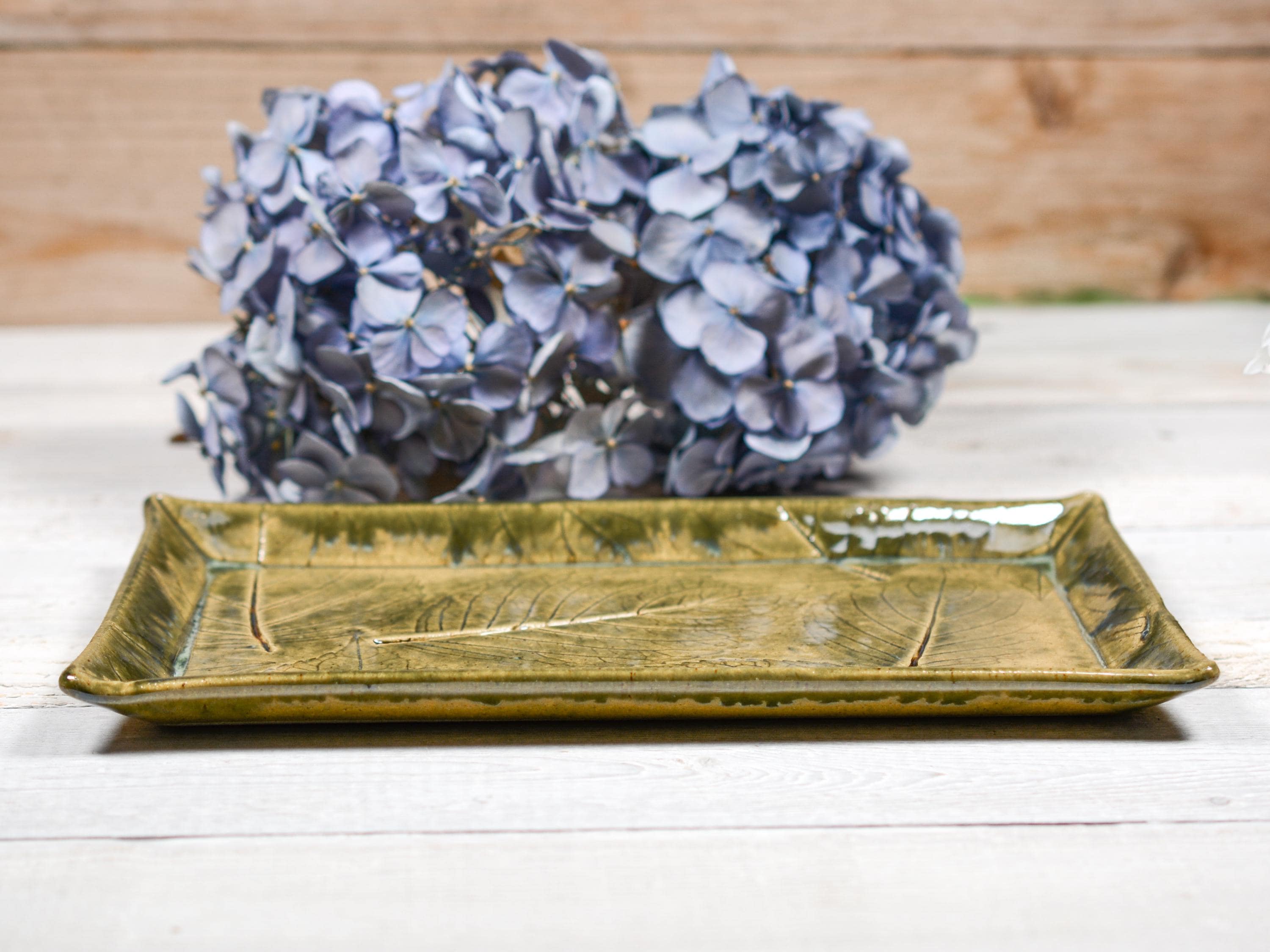This unique tray has hydrangea leaf impressions scattered all over. The surface is still fairly smooth, so easy to clean when serving food, or use as a pretty place for kitchen items, vanity items, small flower pots, etc.