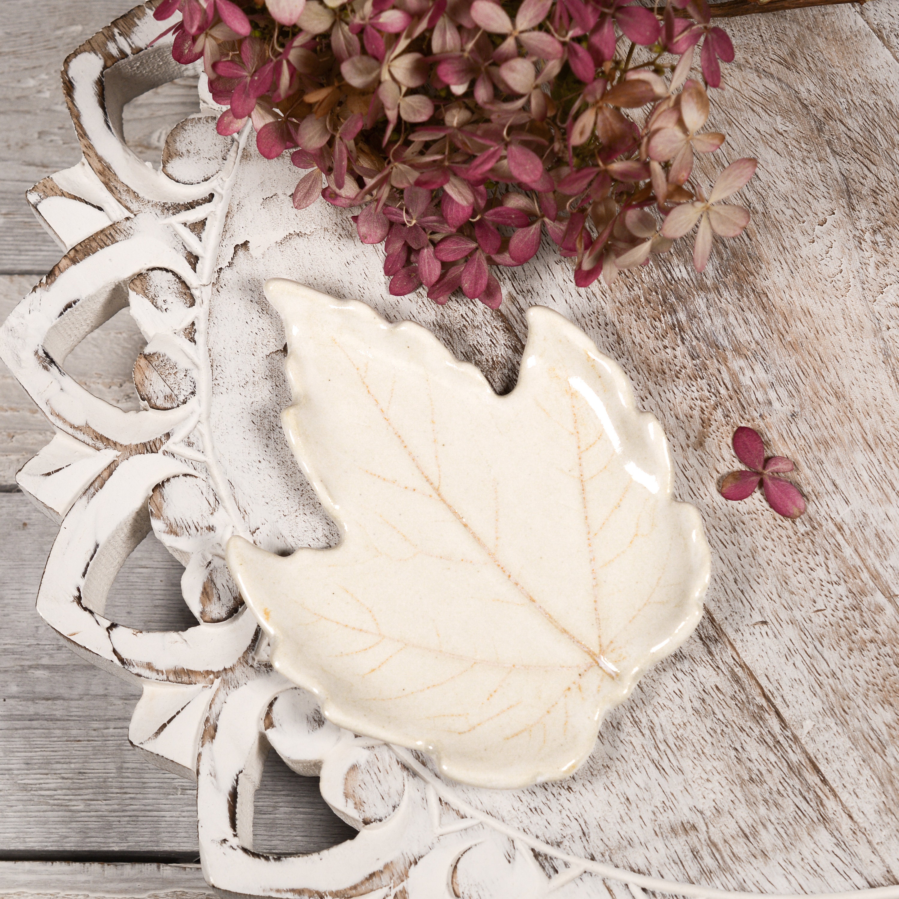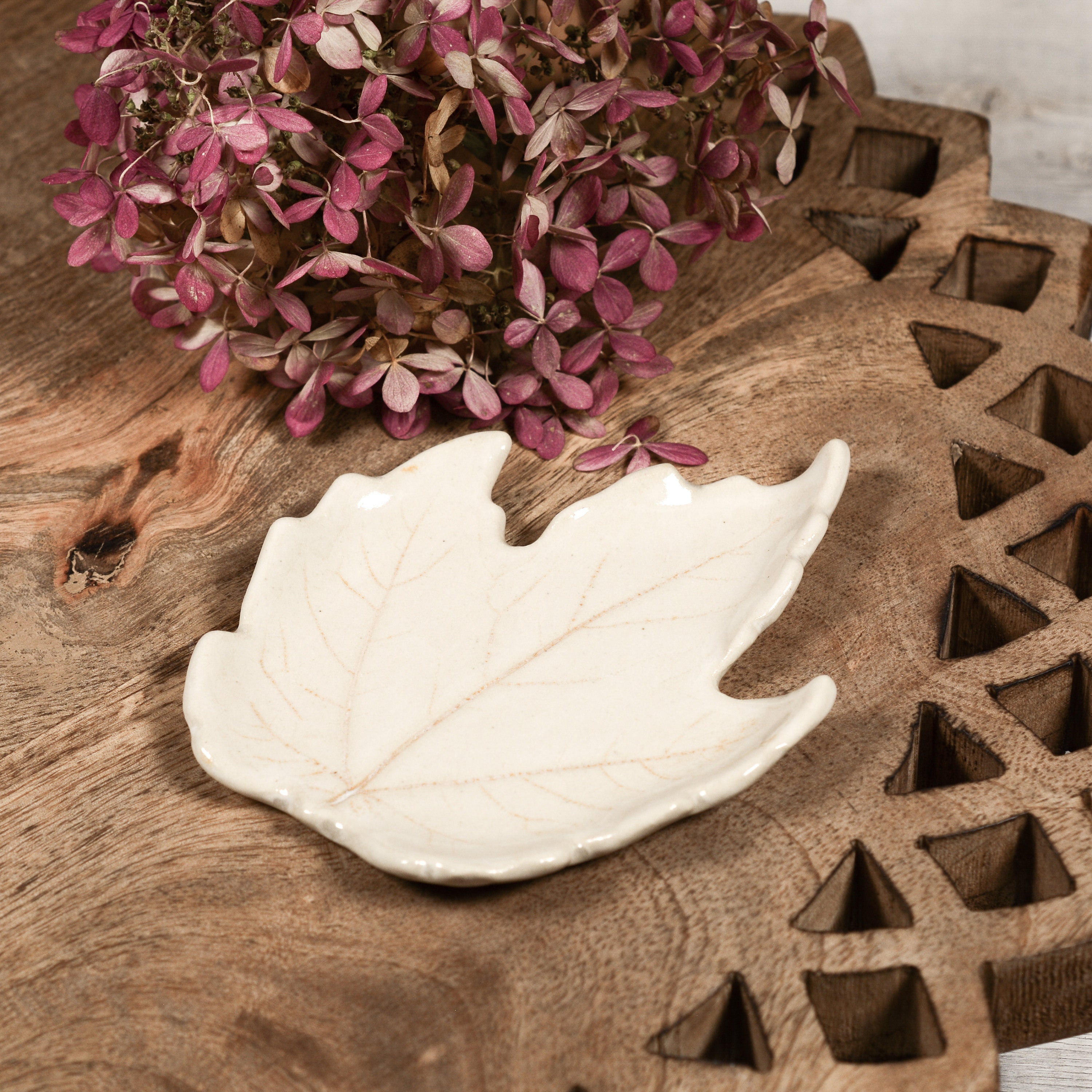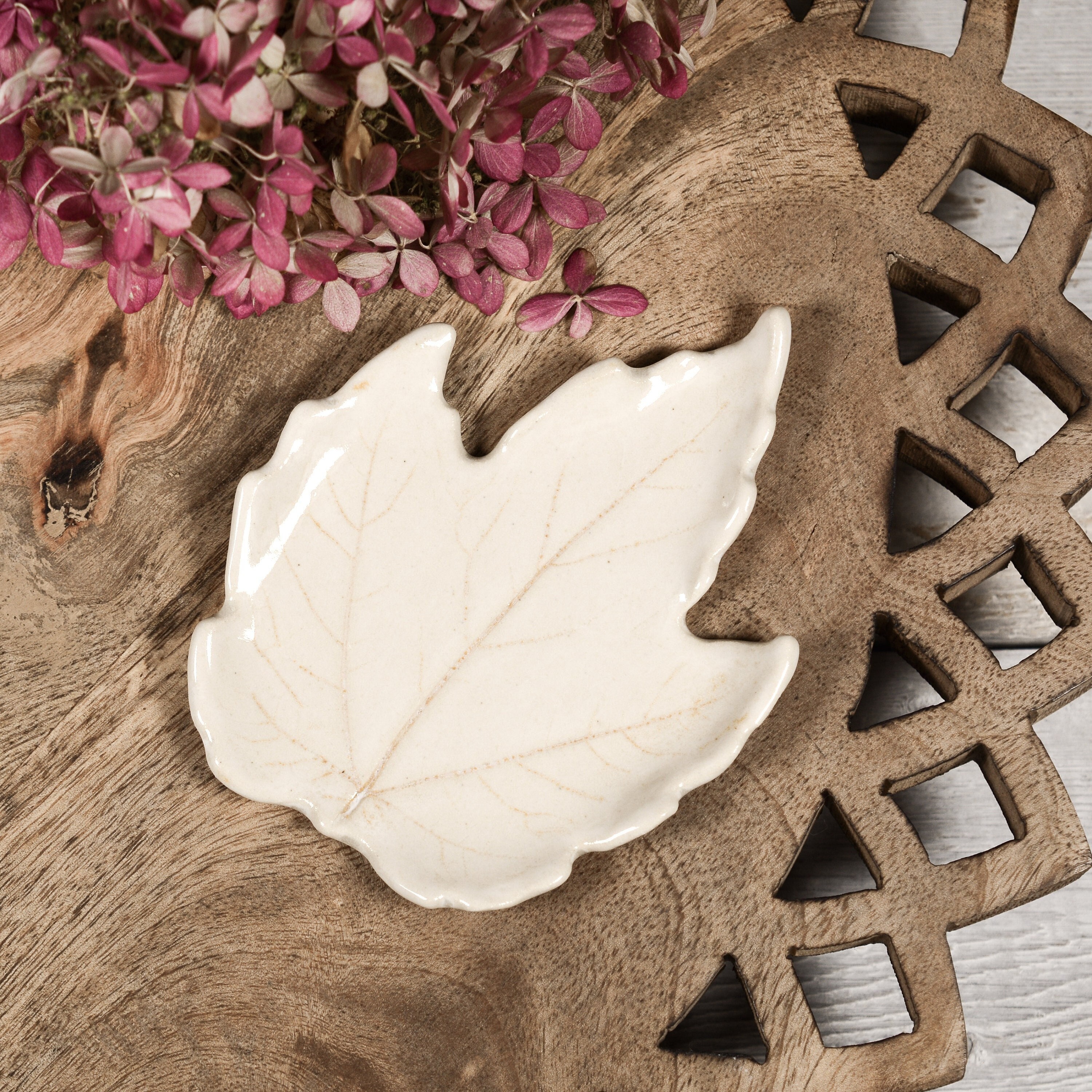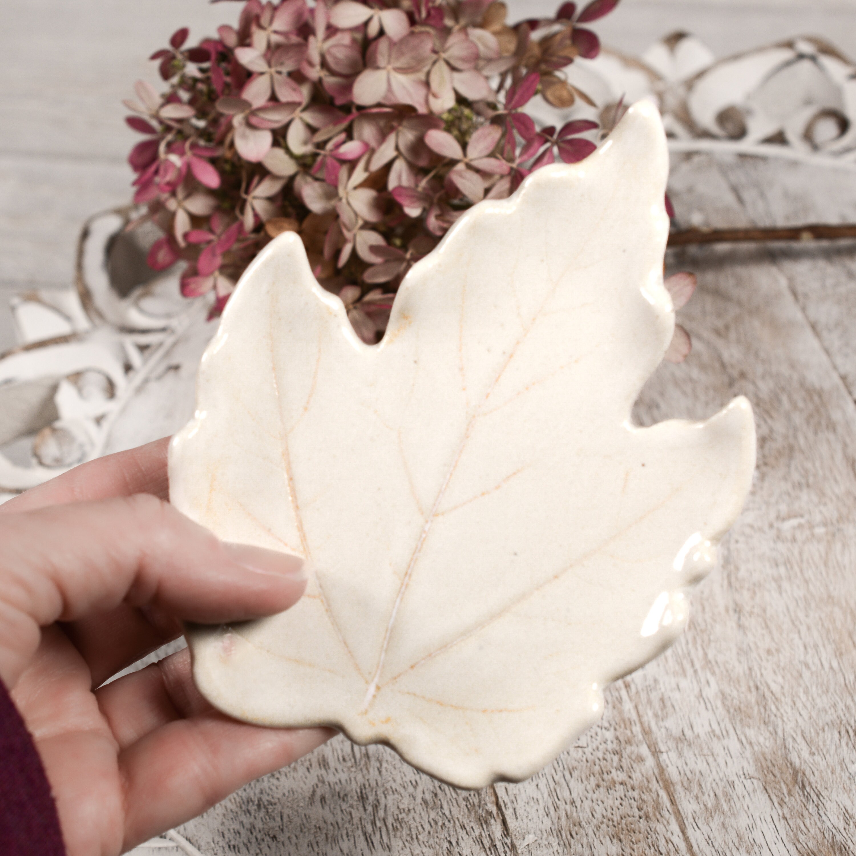 An ivory maple leaf with subtle orange veins. Use as a teabag rest, ring dish, or small spoon rest.