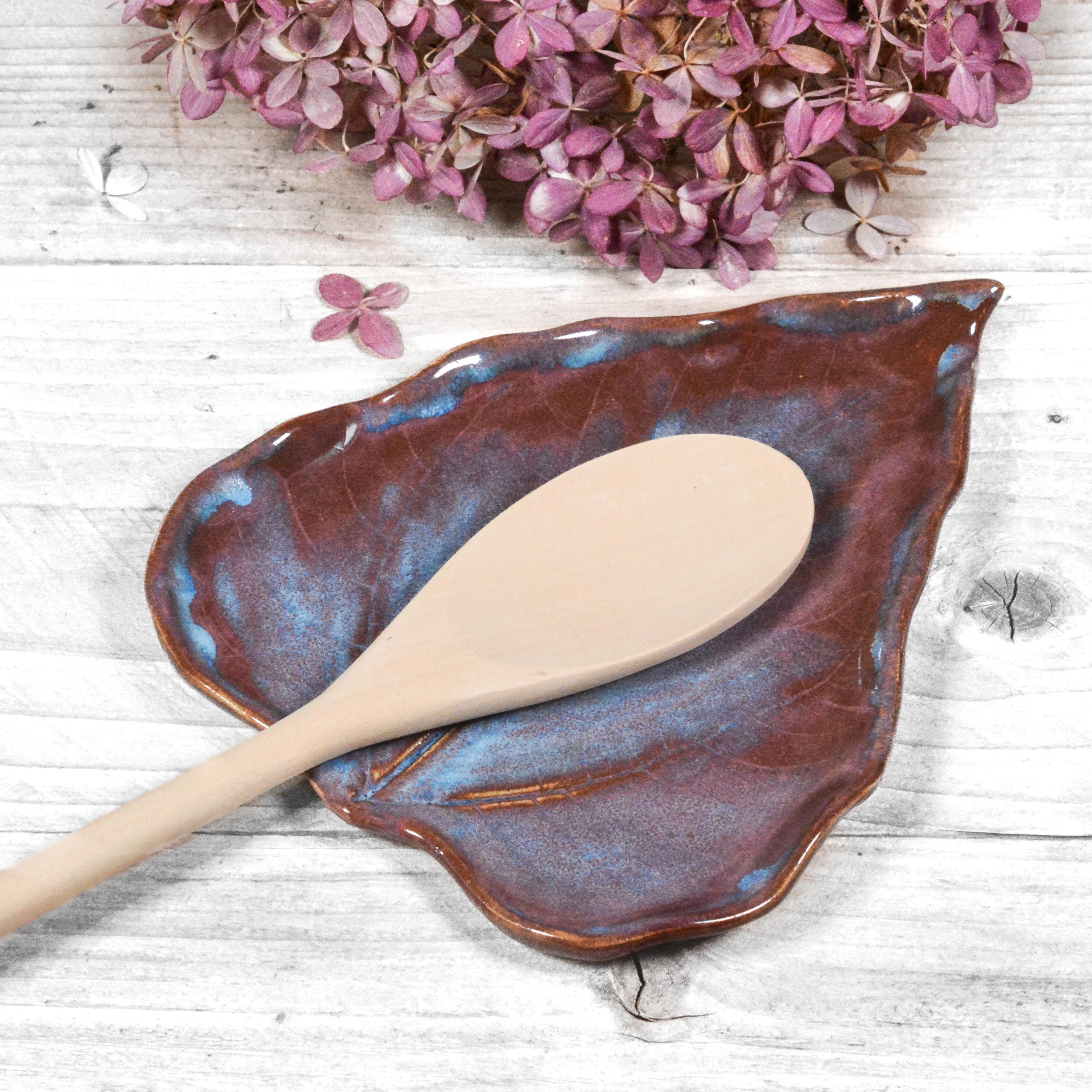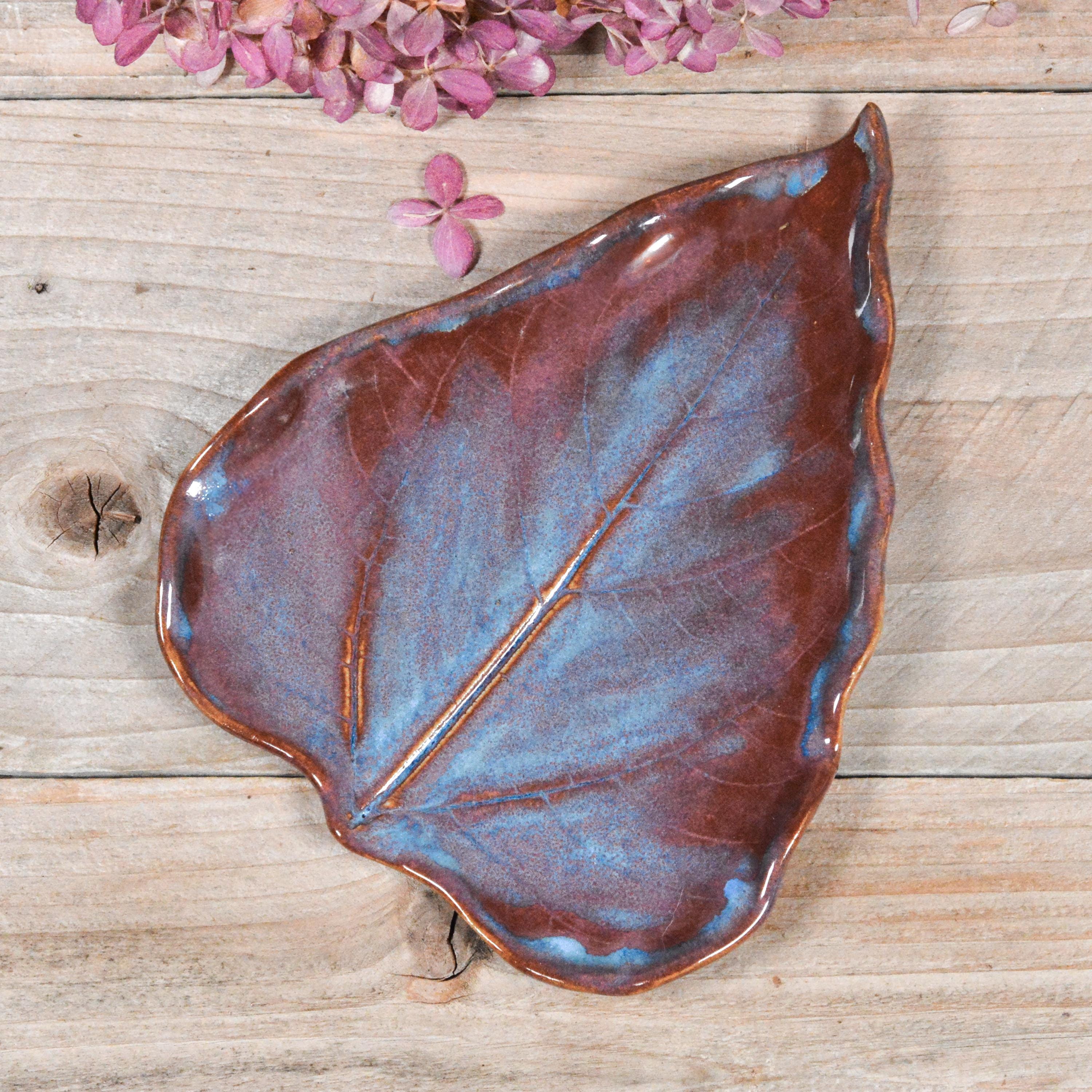 A sunflower leaf to use as a piece of art in your decor, or a large spoon rest. Also works great as a dish for a messy olive oil or peppermill dispenser. Painted with layers of plum purple and blue glazes. One of a kind.