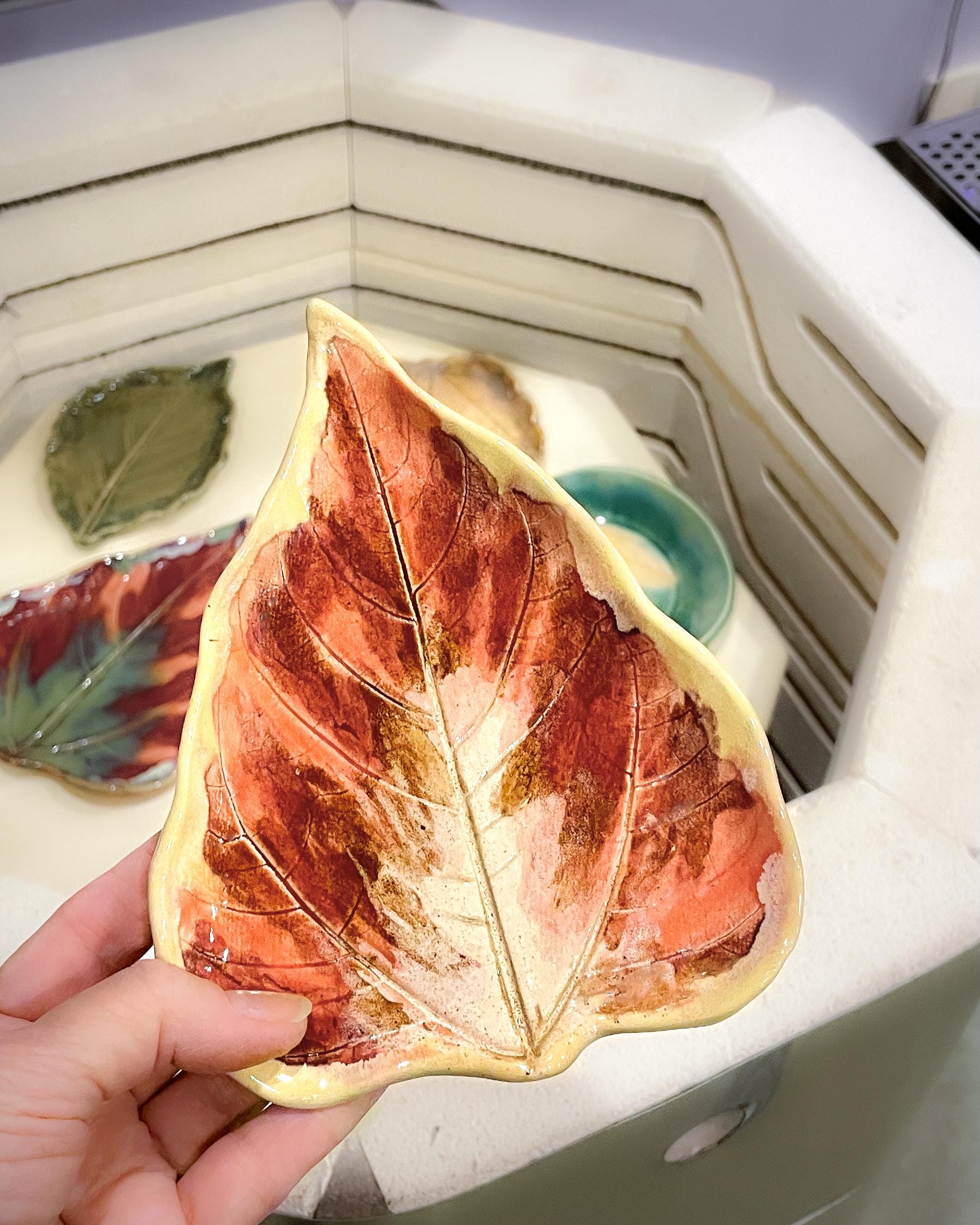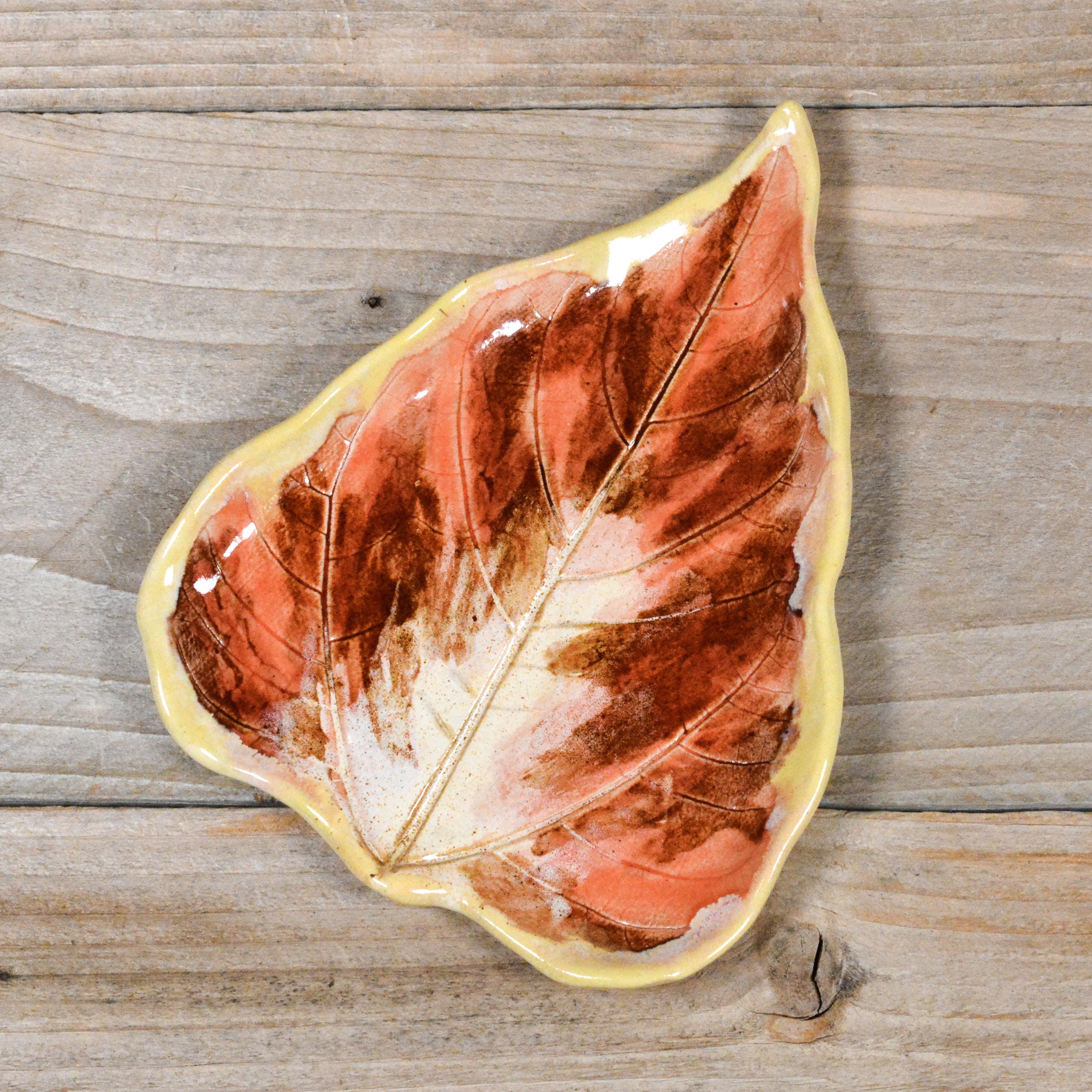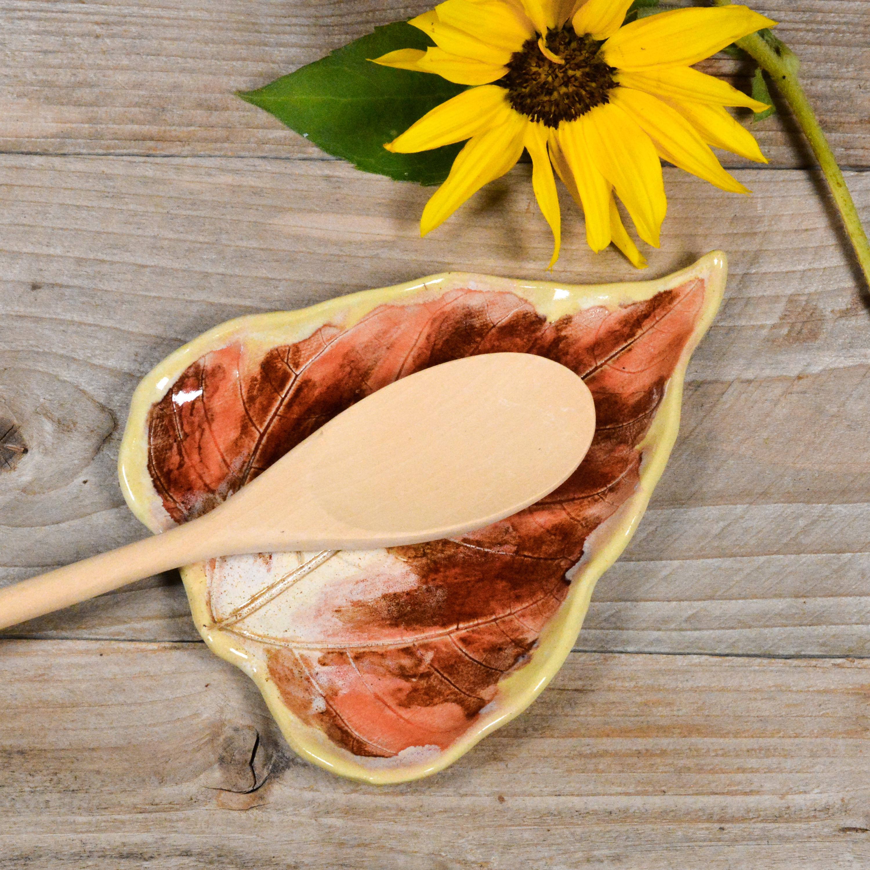 This sunflower leaf is hand painted with layers of rusty red, salmon, and ivory glazes. Light yellow-ivory around the edges. A signed piece of art, designed to be used as a large spoon rest or small plate.