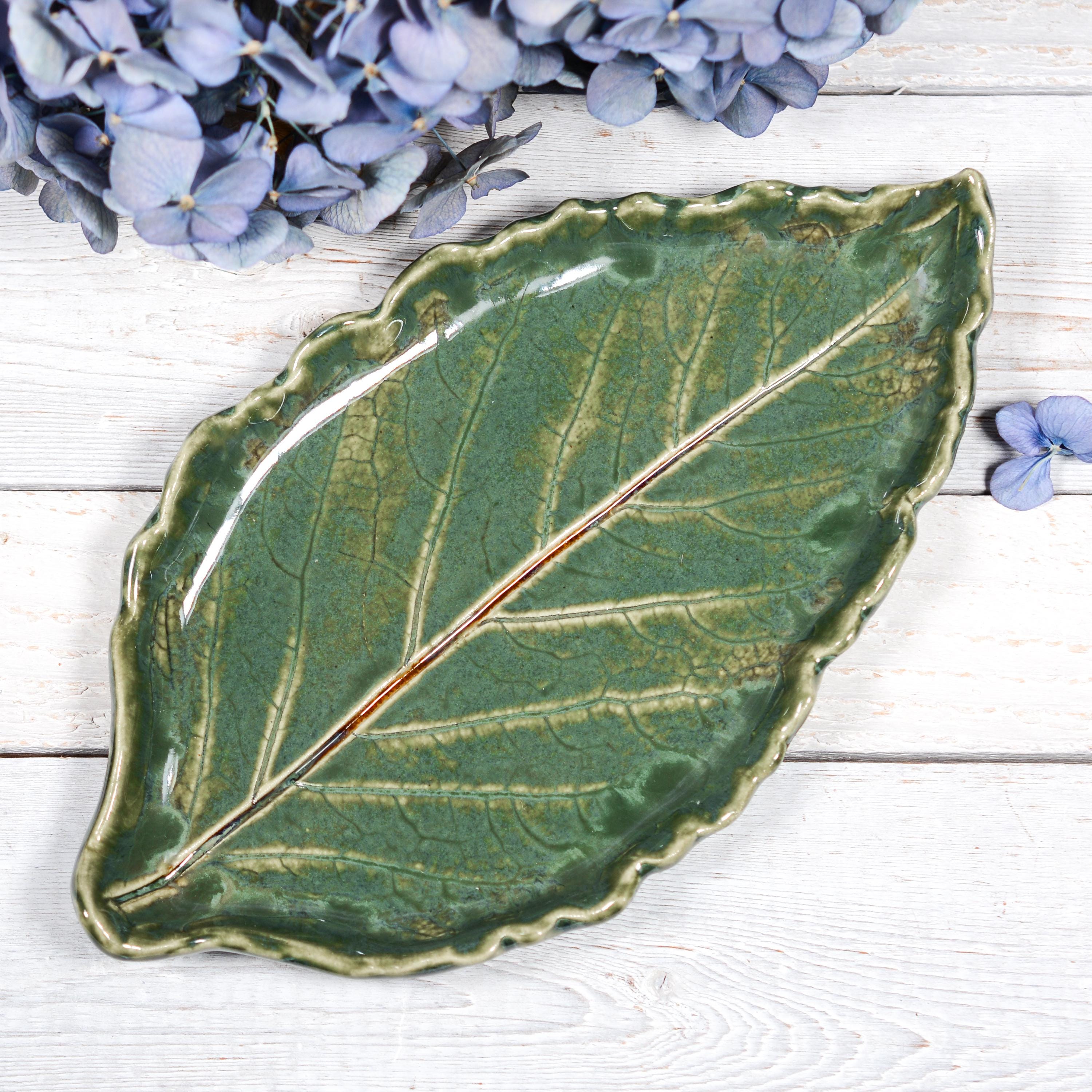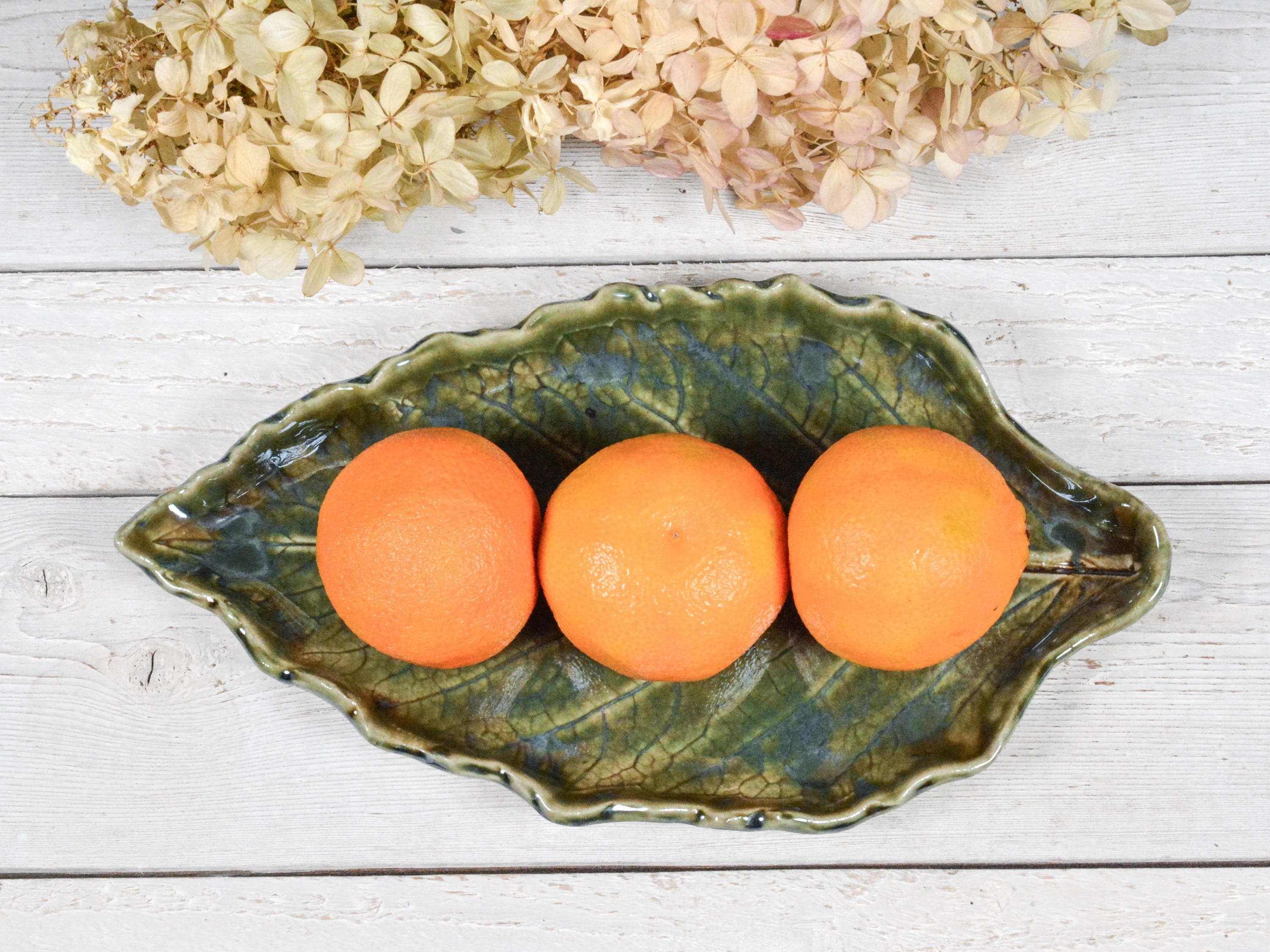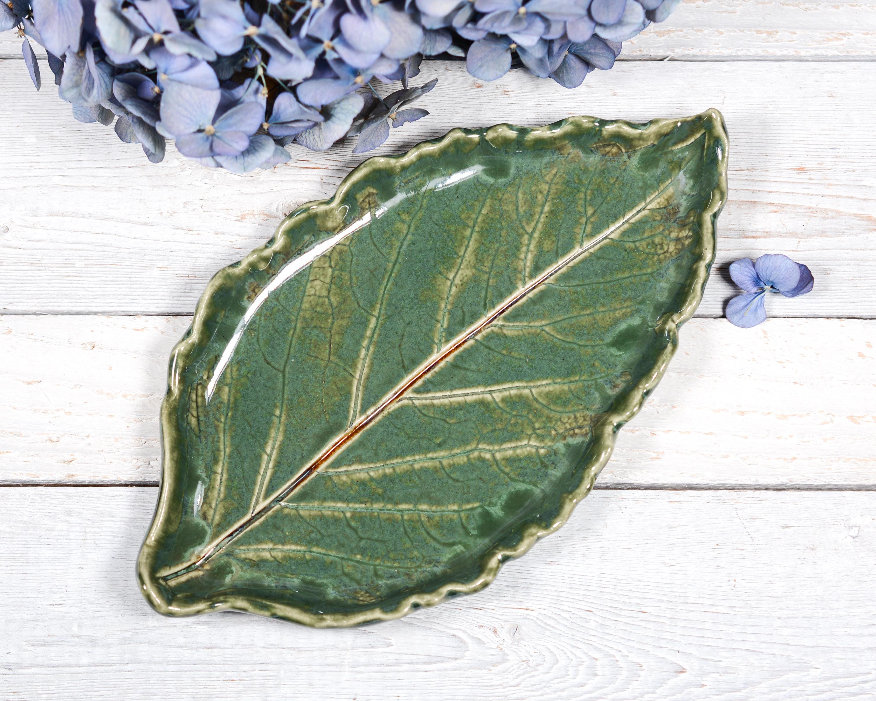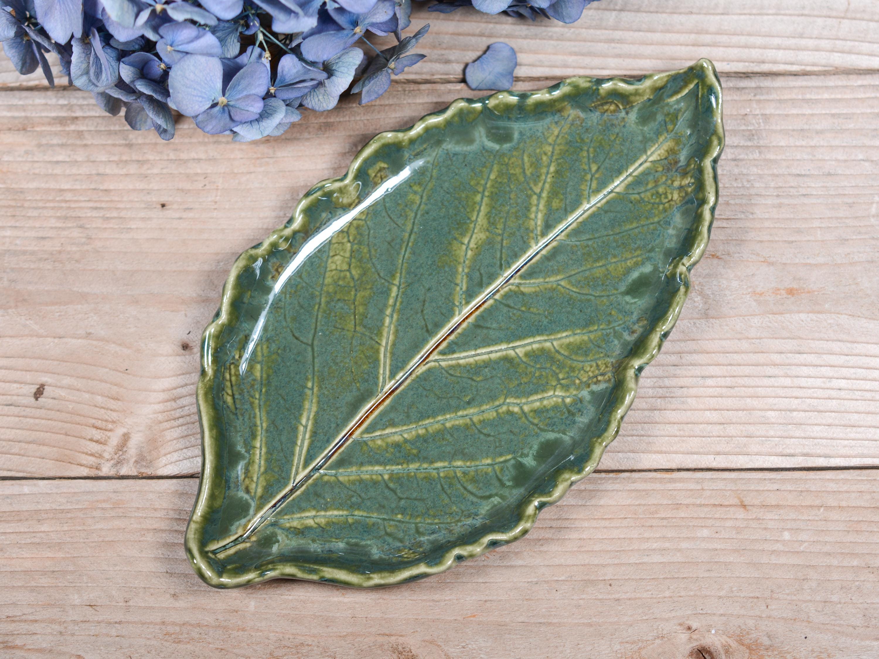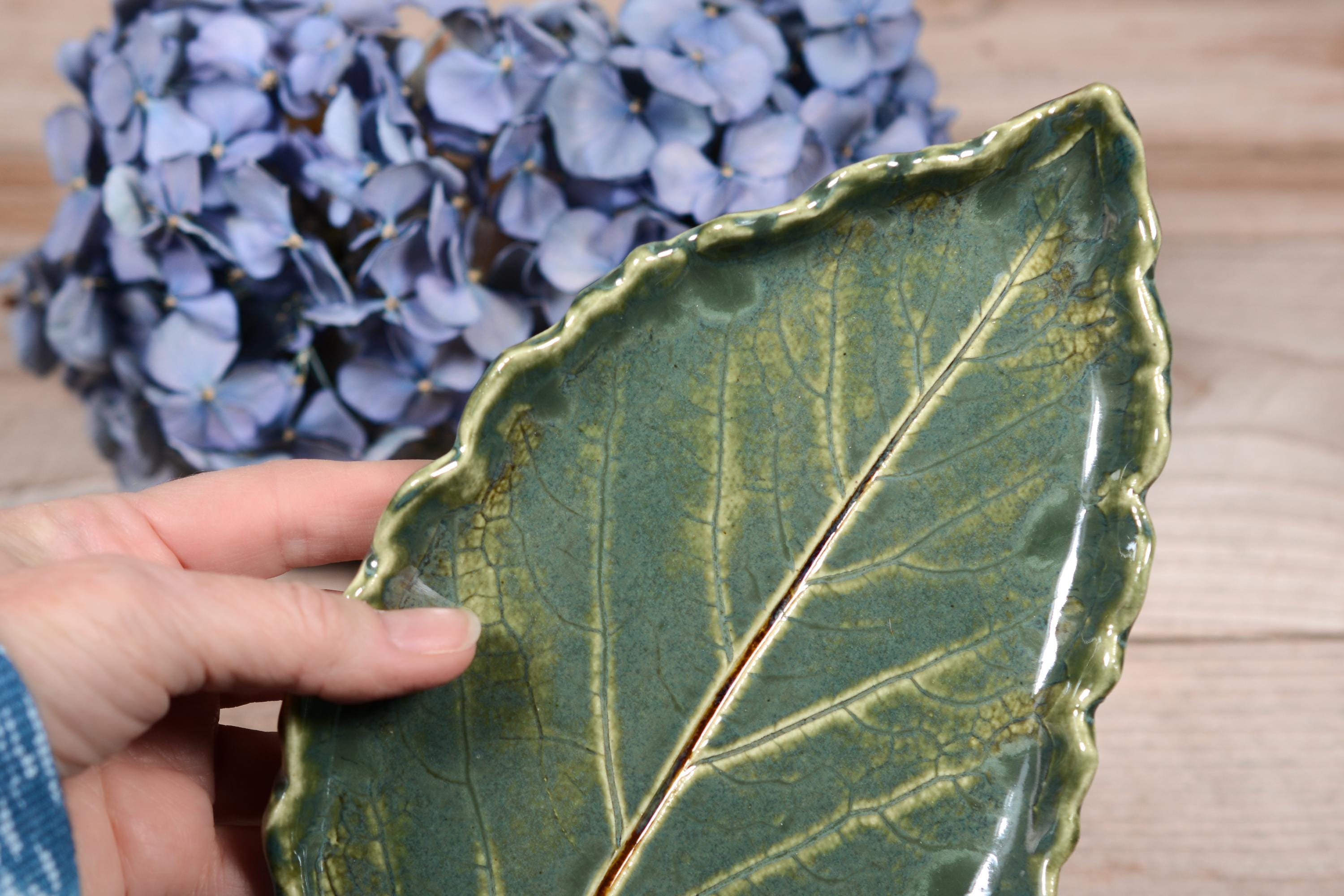 I used an unusually large dahlia leaf from my garden to make this piece. Functional ceramic art to use to serve hors d’oeuvres, etc. Add to your decor and display on a tabletop when not serving food. Hand painted with layers of dark green glazes.