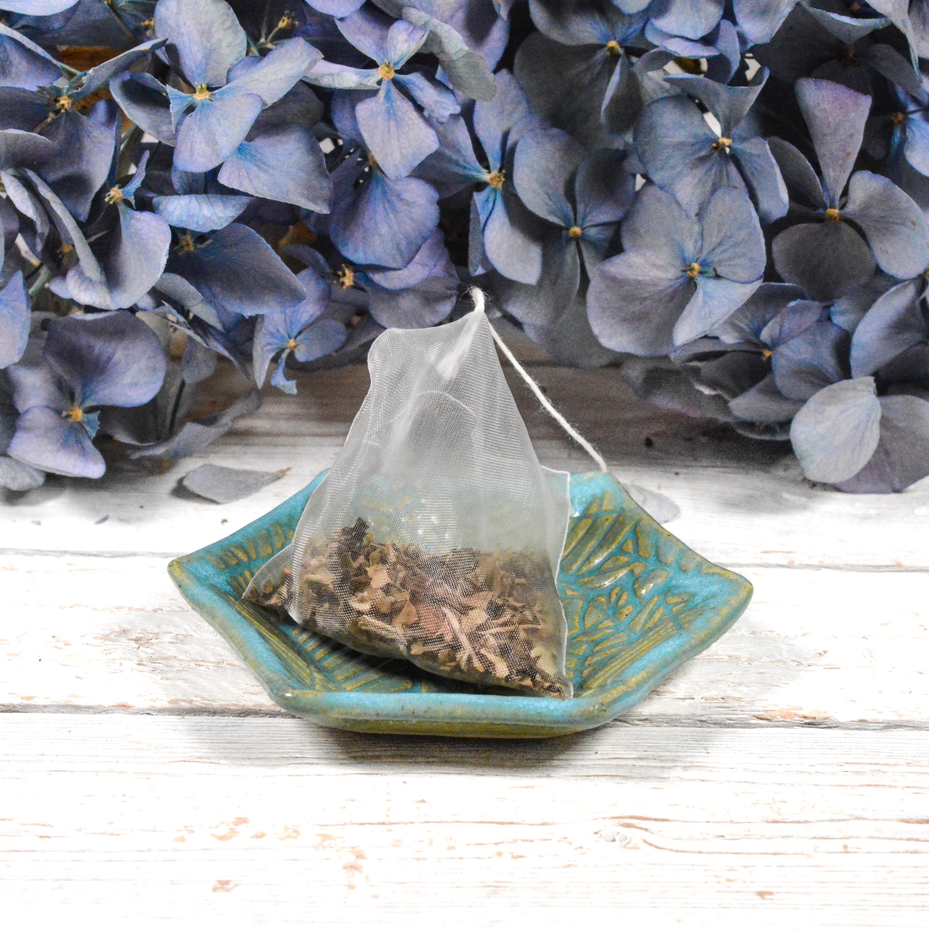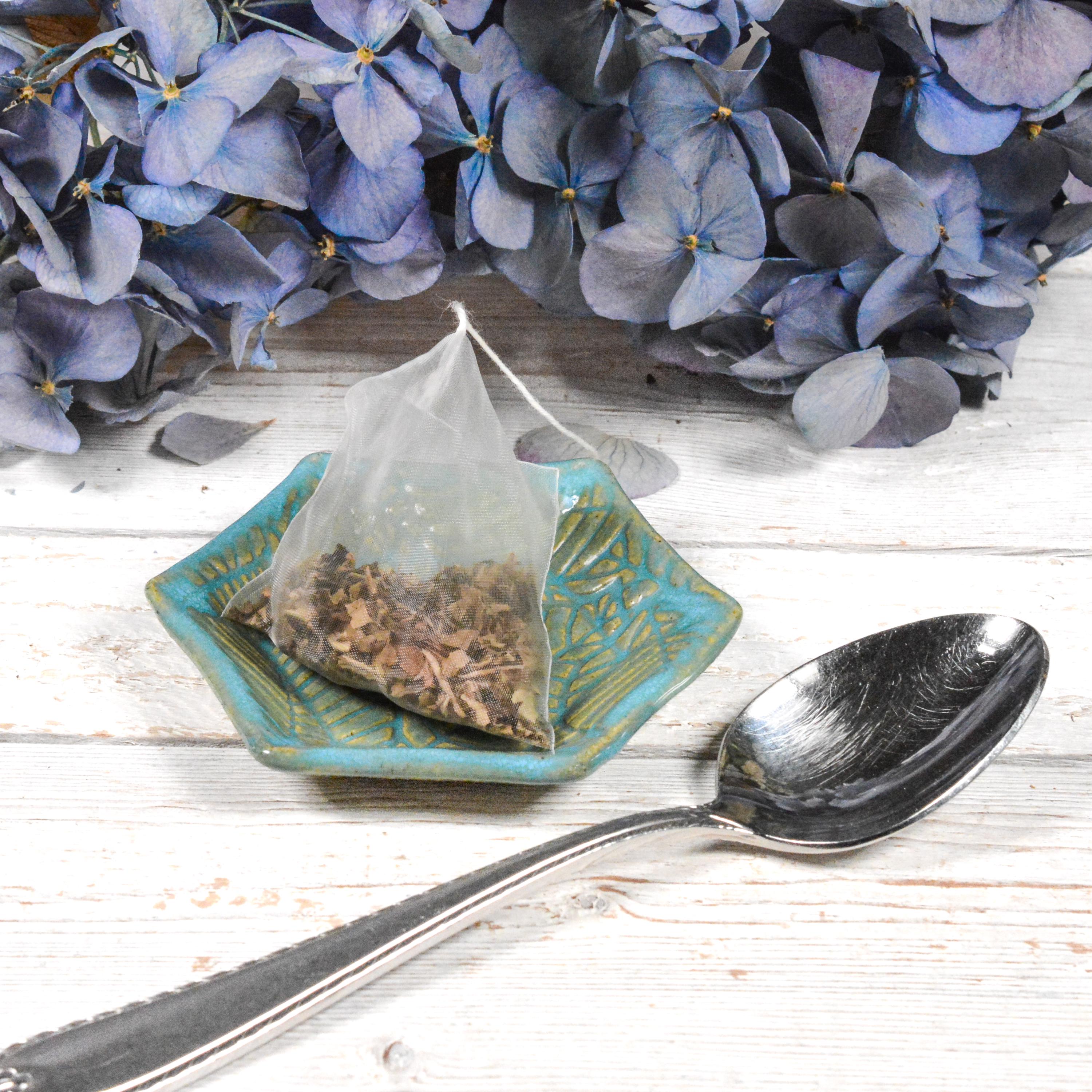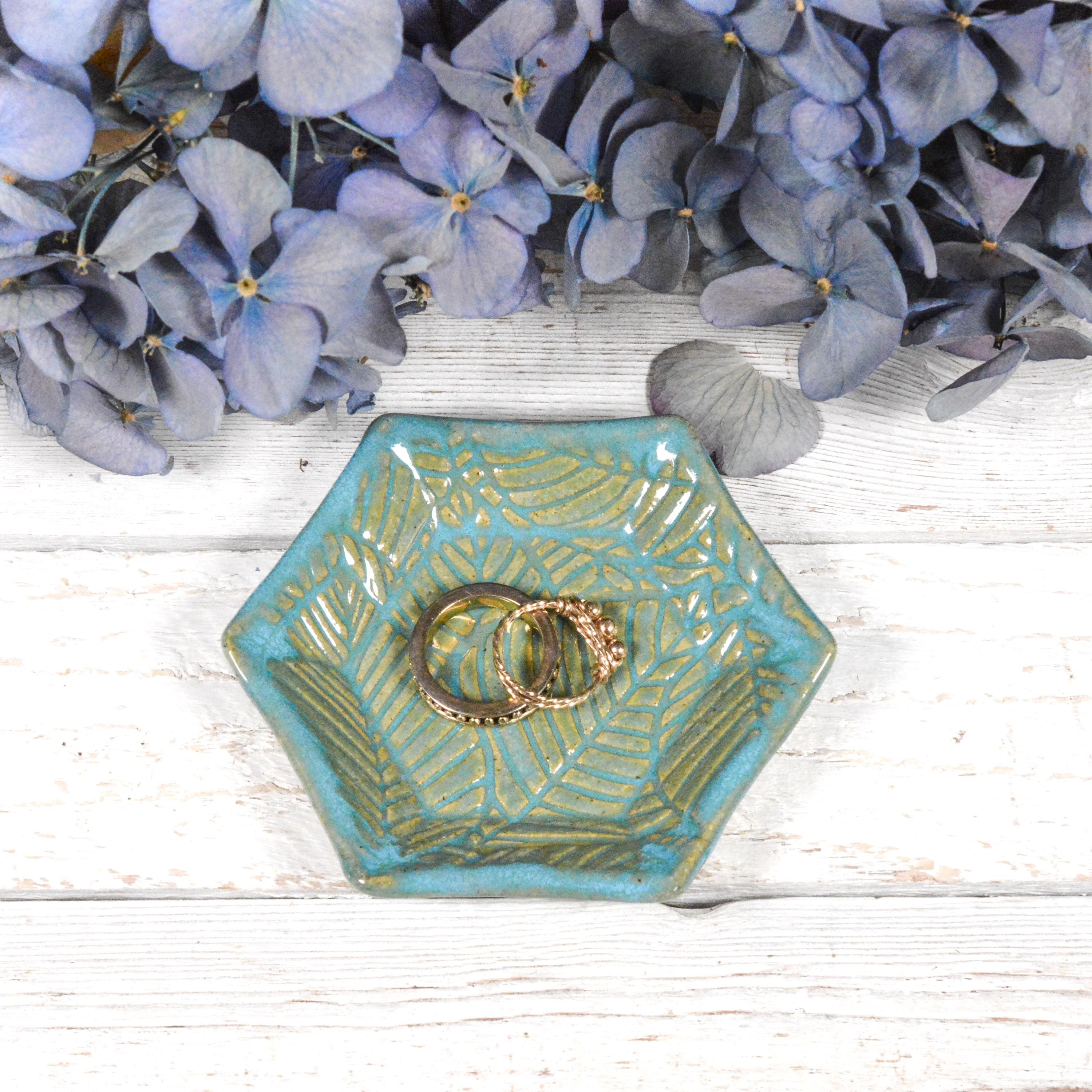 A leaf design graces this little handmade ceramic dish. Use for dipping sauces, a tea bag rest, pill dish or ring dish. Glazed in a transparent blue that allows the clay's speckles and colour to show through.