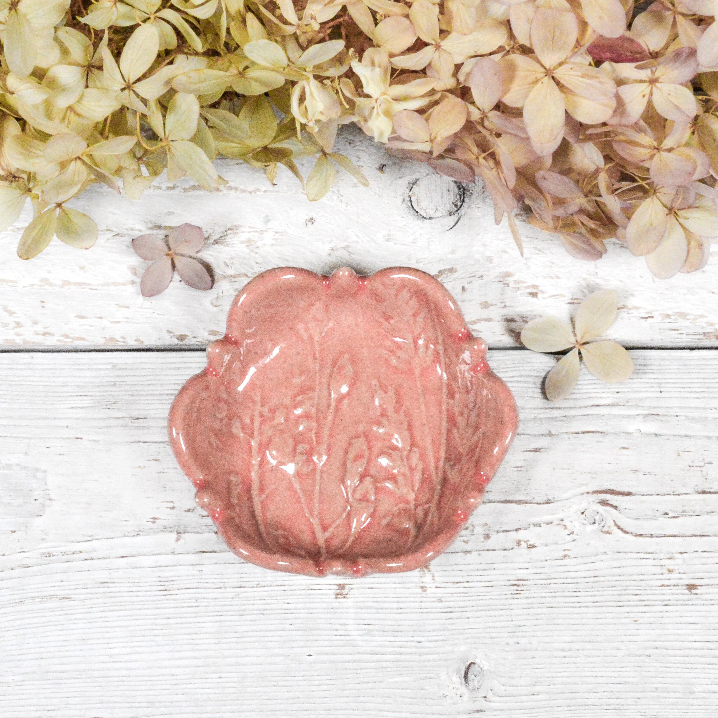 A little pink ceramic dish with a raised floral design and scalloped edge.