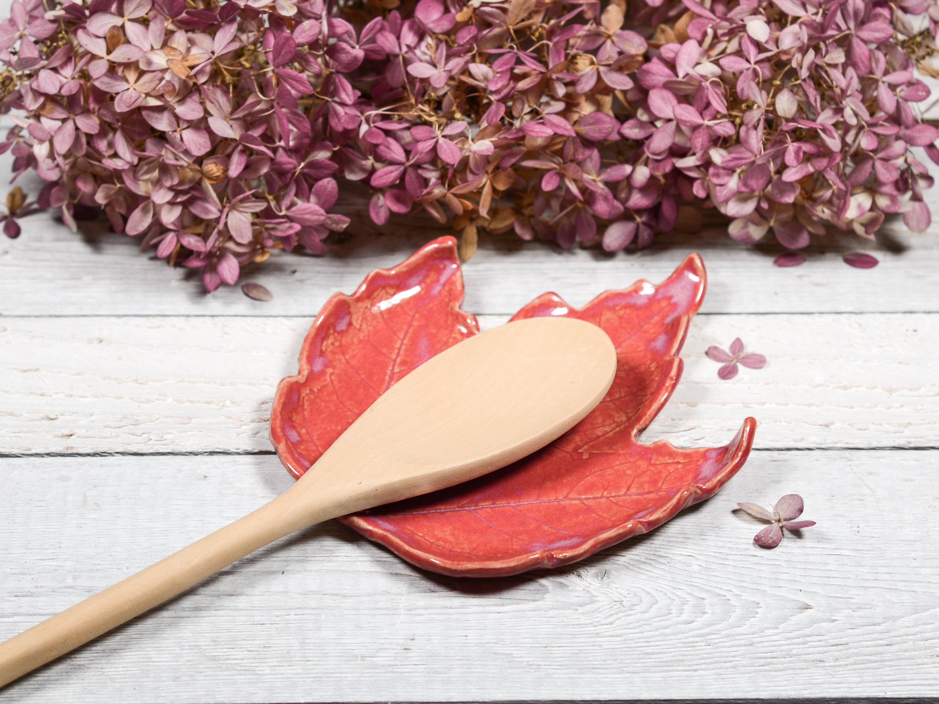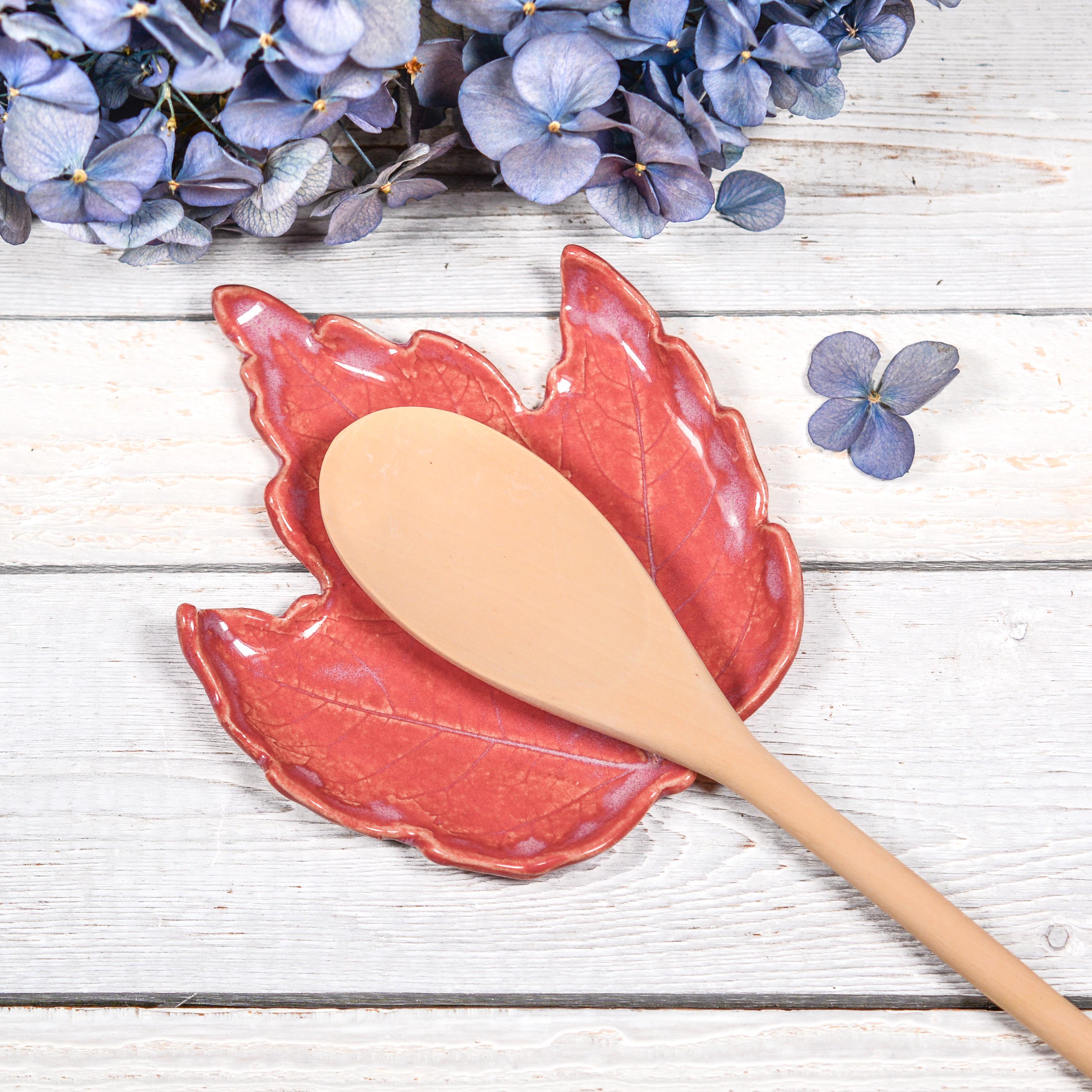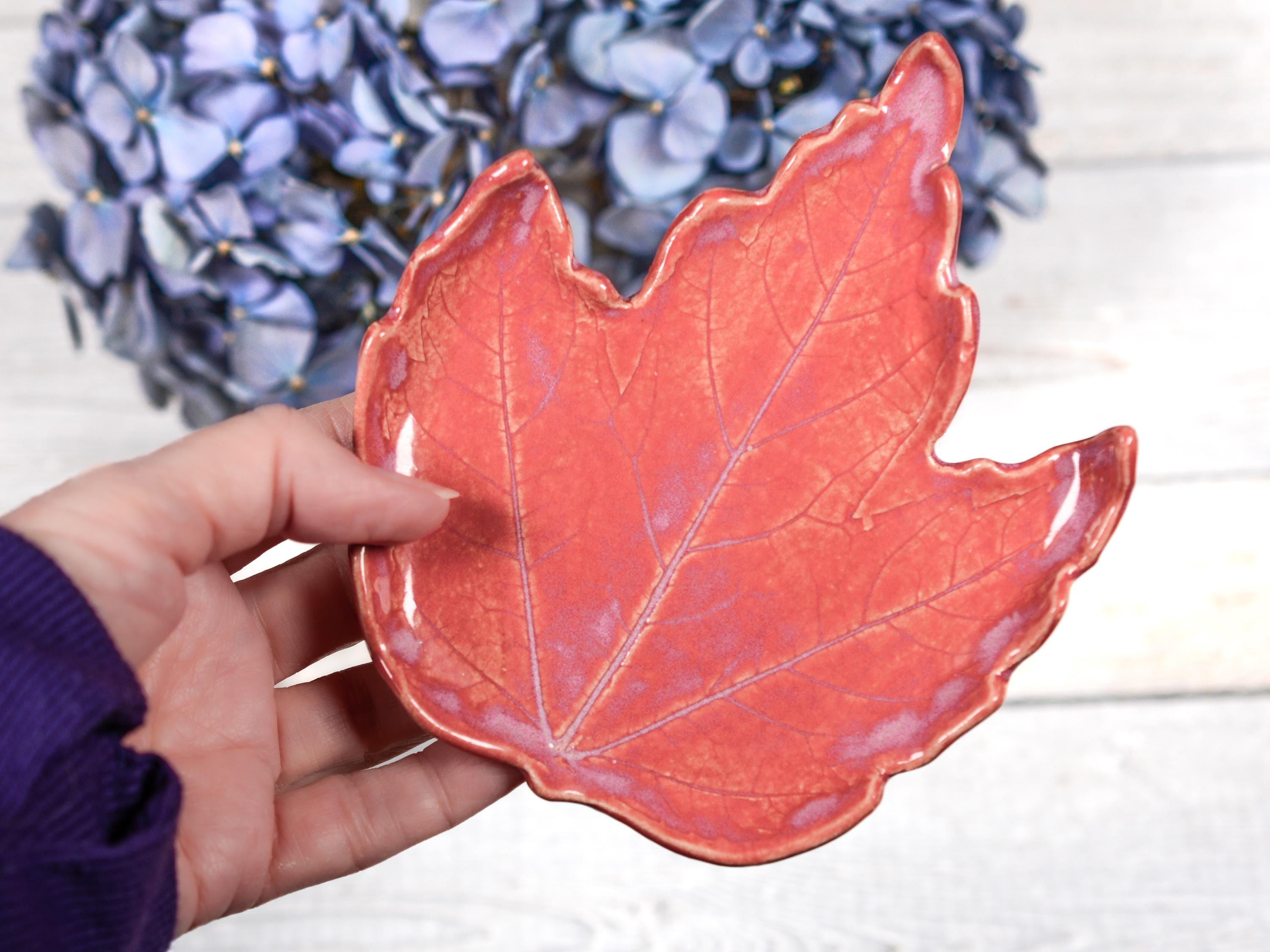 Add this colorful maple leaf to your decor as a piece of art, or use as a spoon rest to brighten up your kitchen. Glazed in layers of pink with light lavender accents.