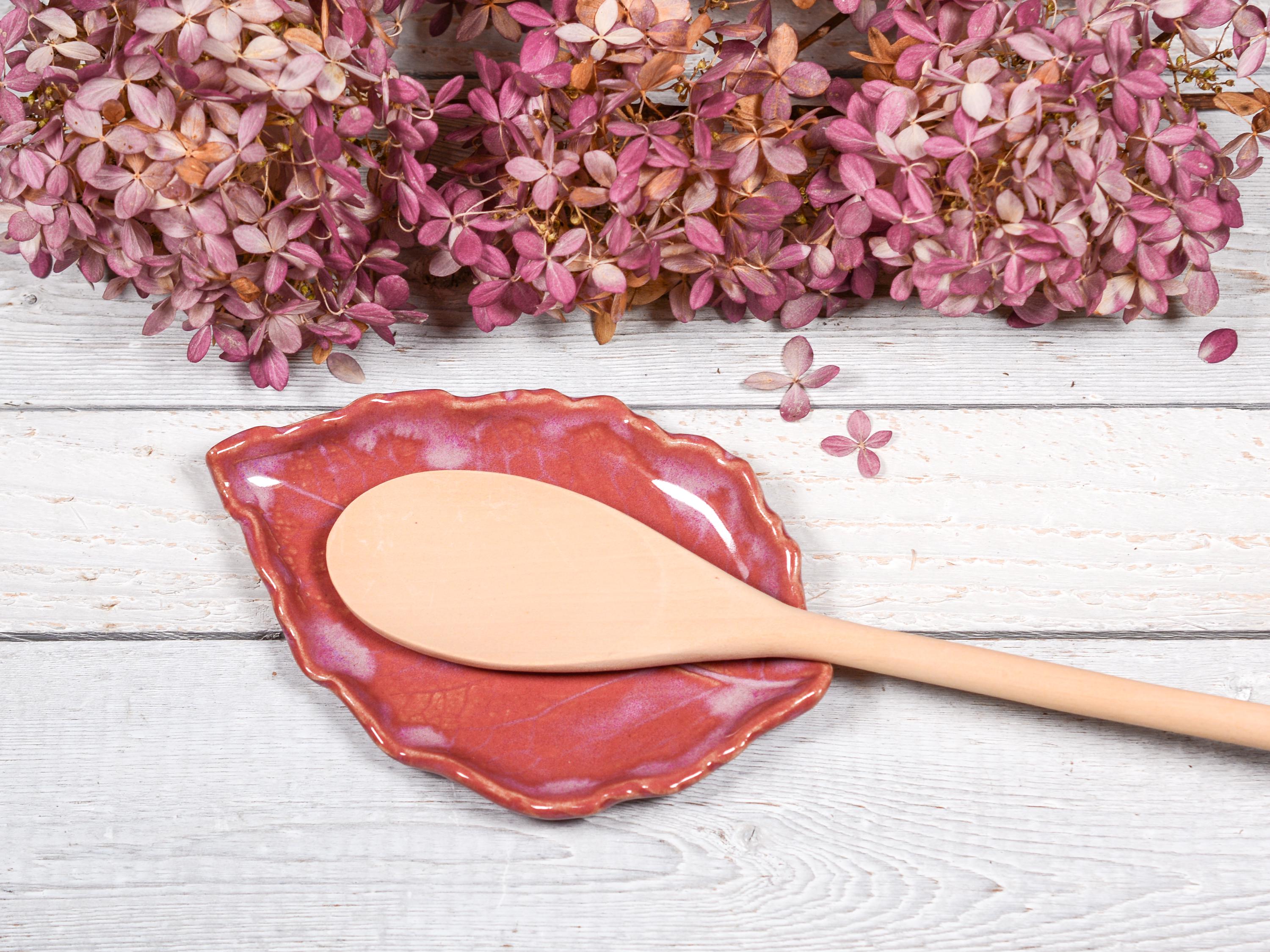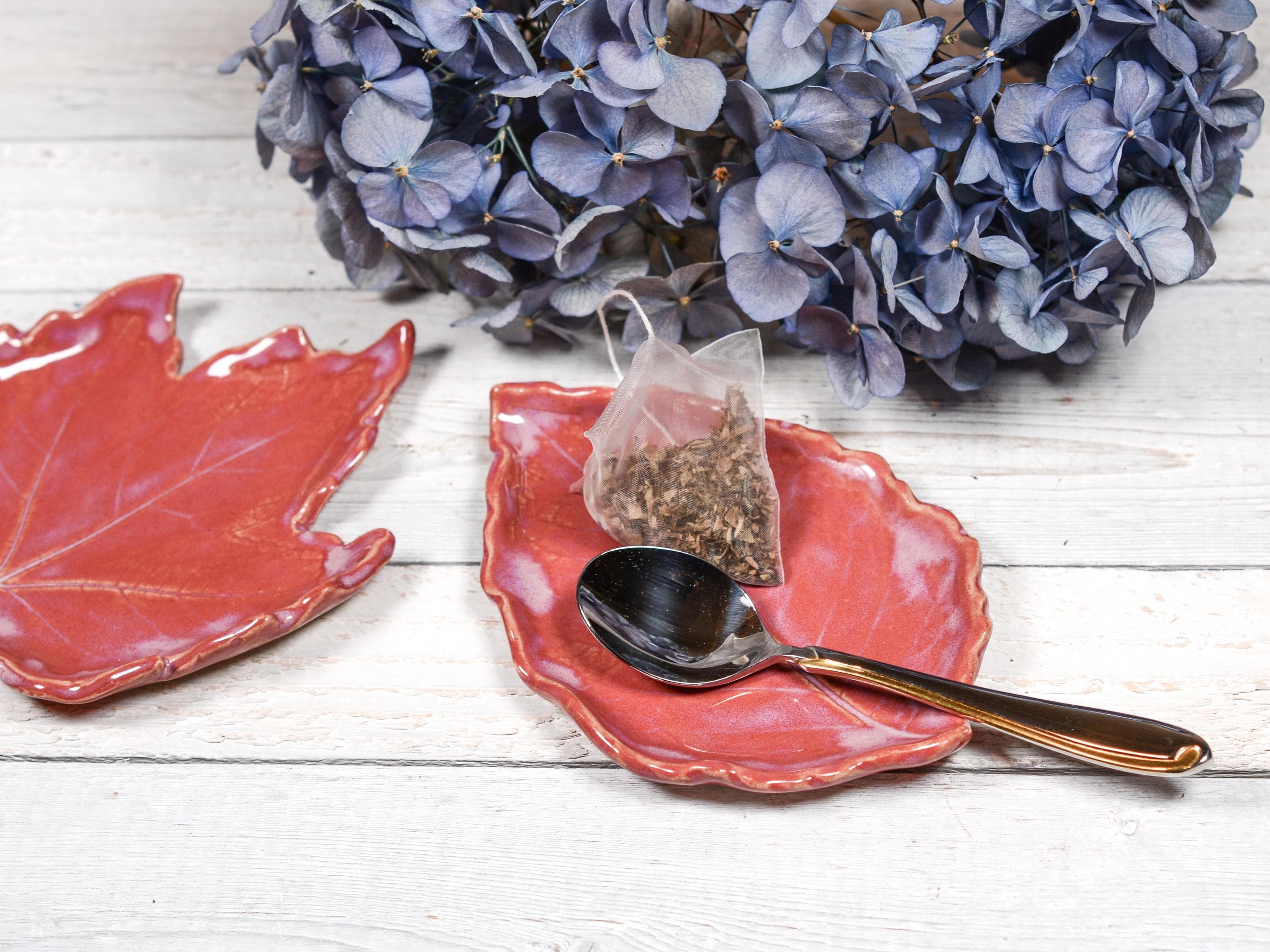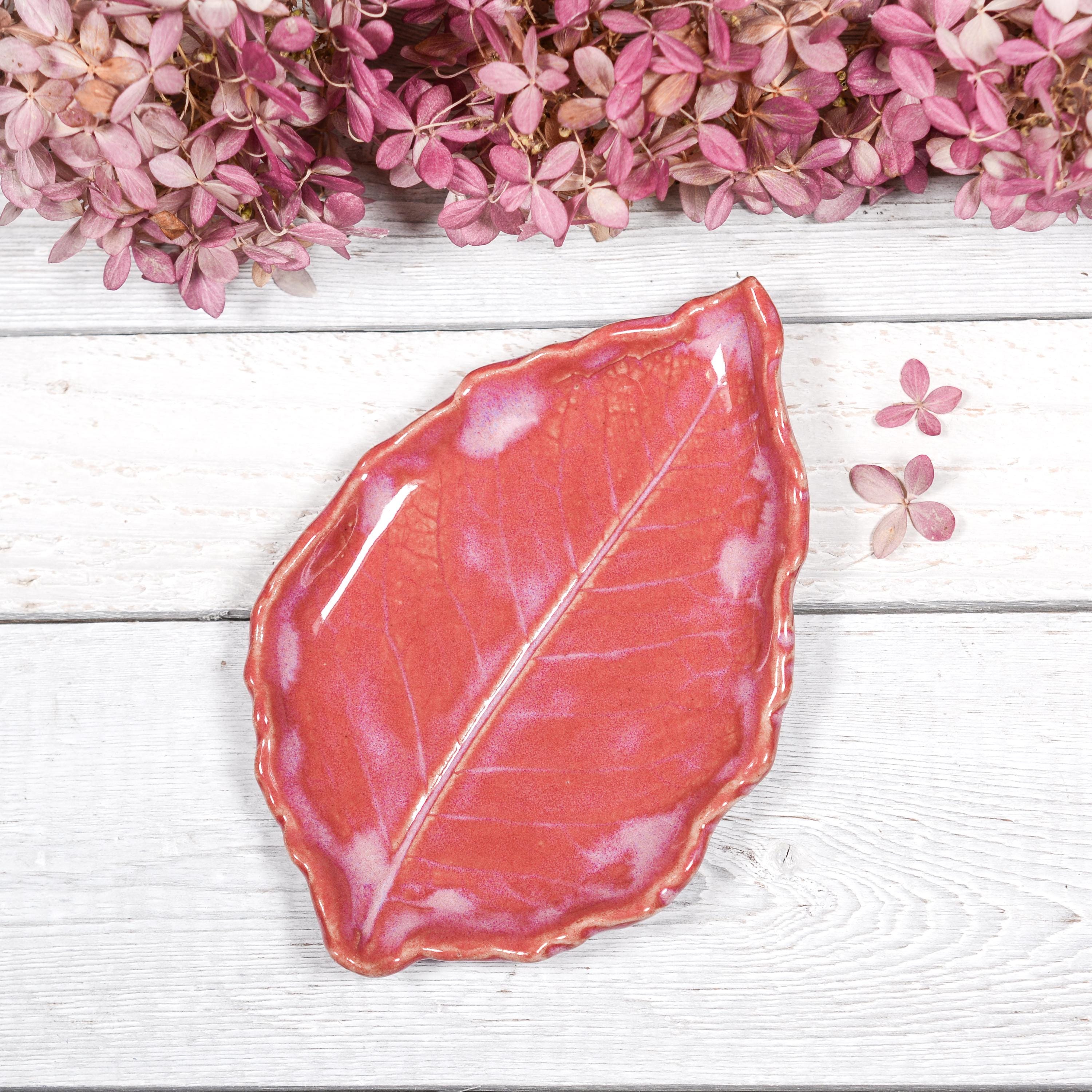 A little piece of art, made from a dahlia leaf, that can be used as a spoon rest, tea bag rest, trinket dish and more. Glazed with layers of gloss pink glaze with a few lavender accents. I have a maple leaf the same color: https://melodymudworks.etsy.com/listing/1868237940