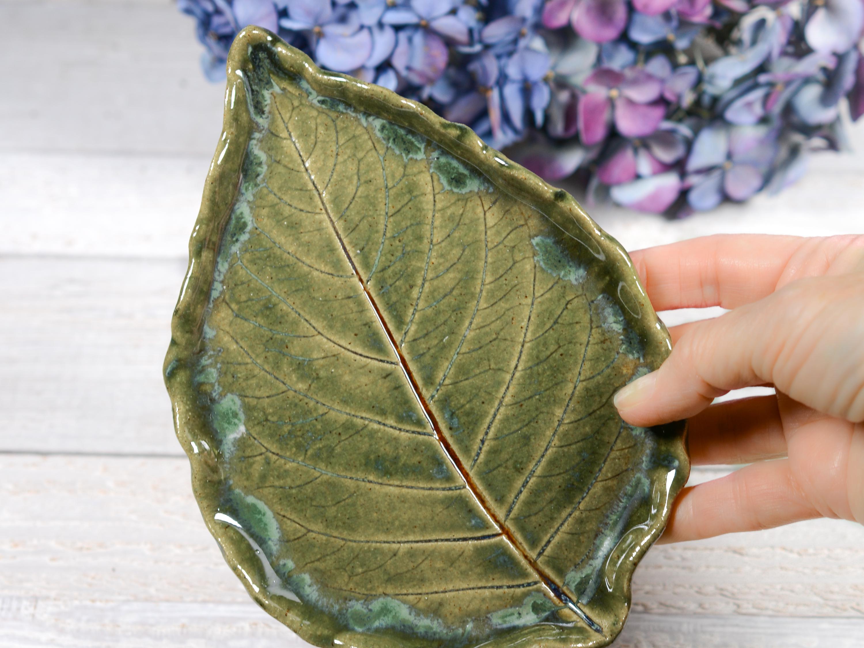 HANDMADE with Washington clay and food safe glazes from a large hydrangea leaf out of my garden. High fired stoneware clay is chip resistant. Nicely finished with attention to detail.
