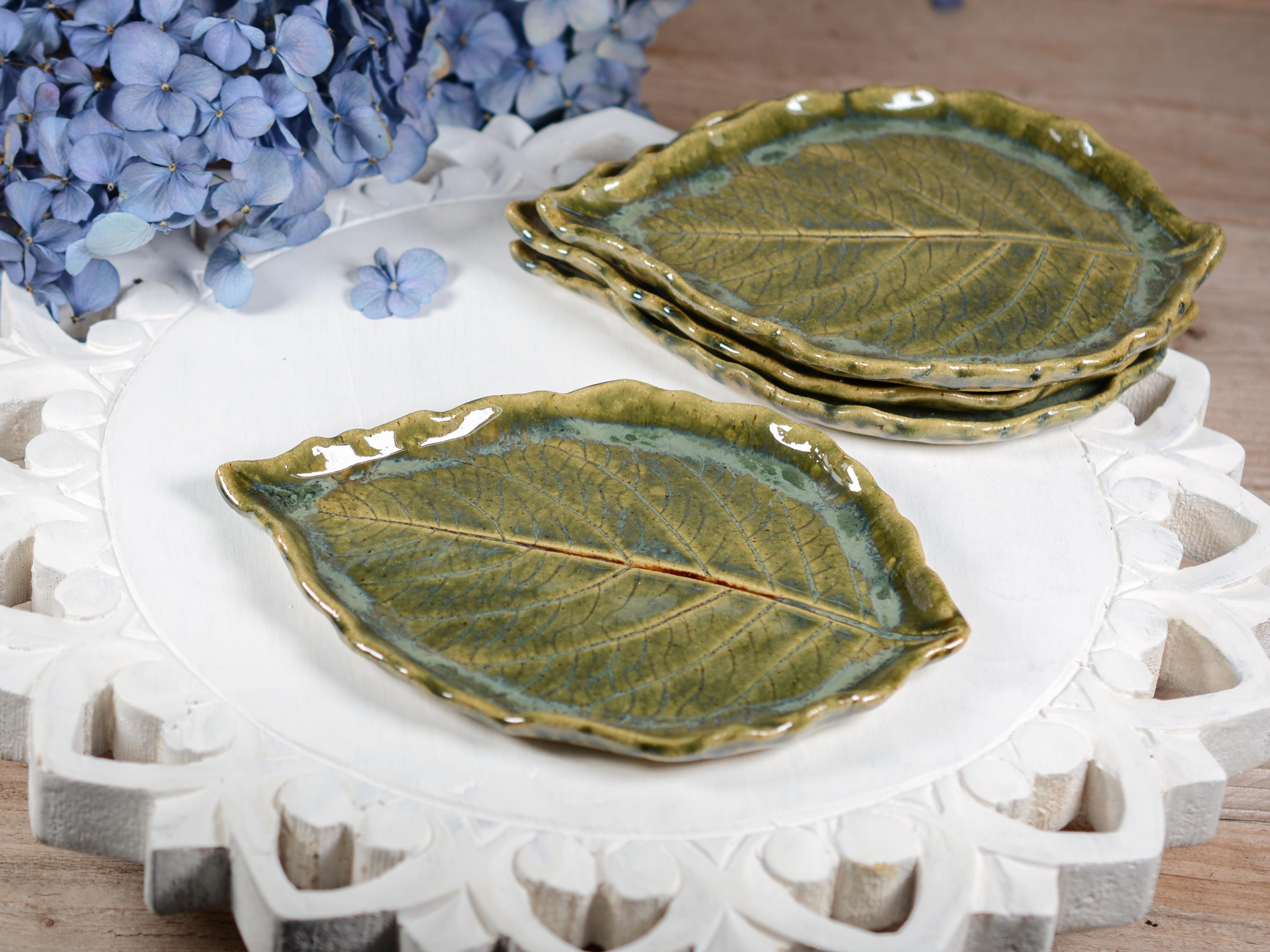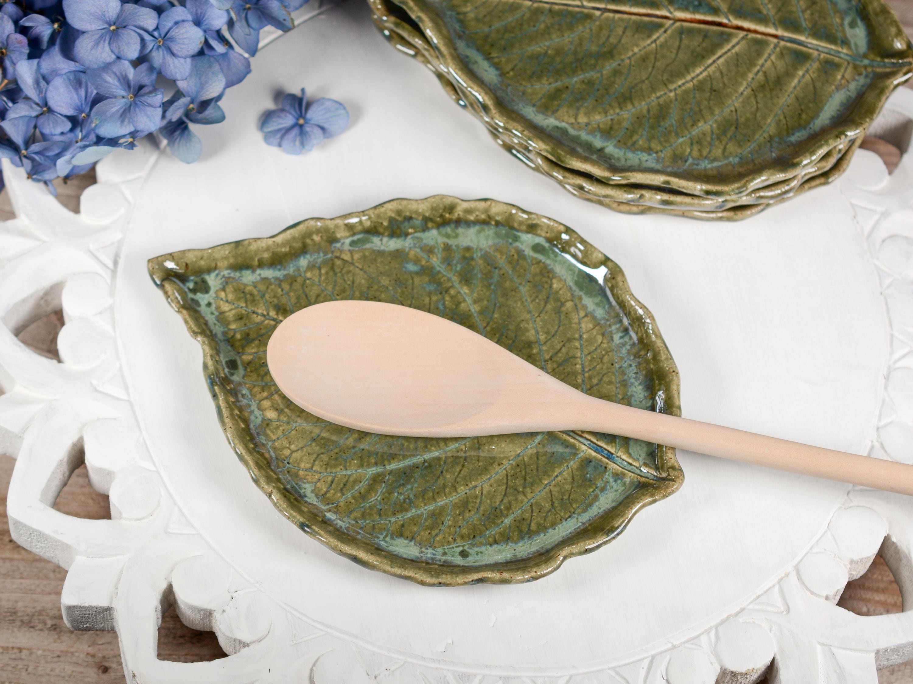 Add some functional art to your kitchen with this ceramic leaf you can use as a large spoon rest or snack plate. Painted with layers of transparent green glazes. Leaves vary, each one is unique.
