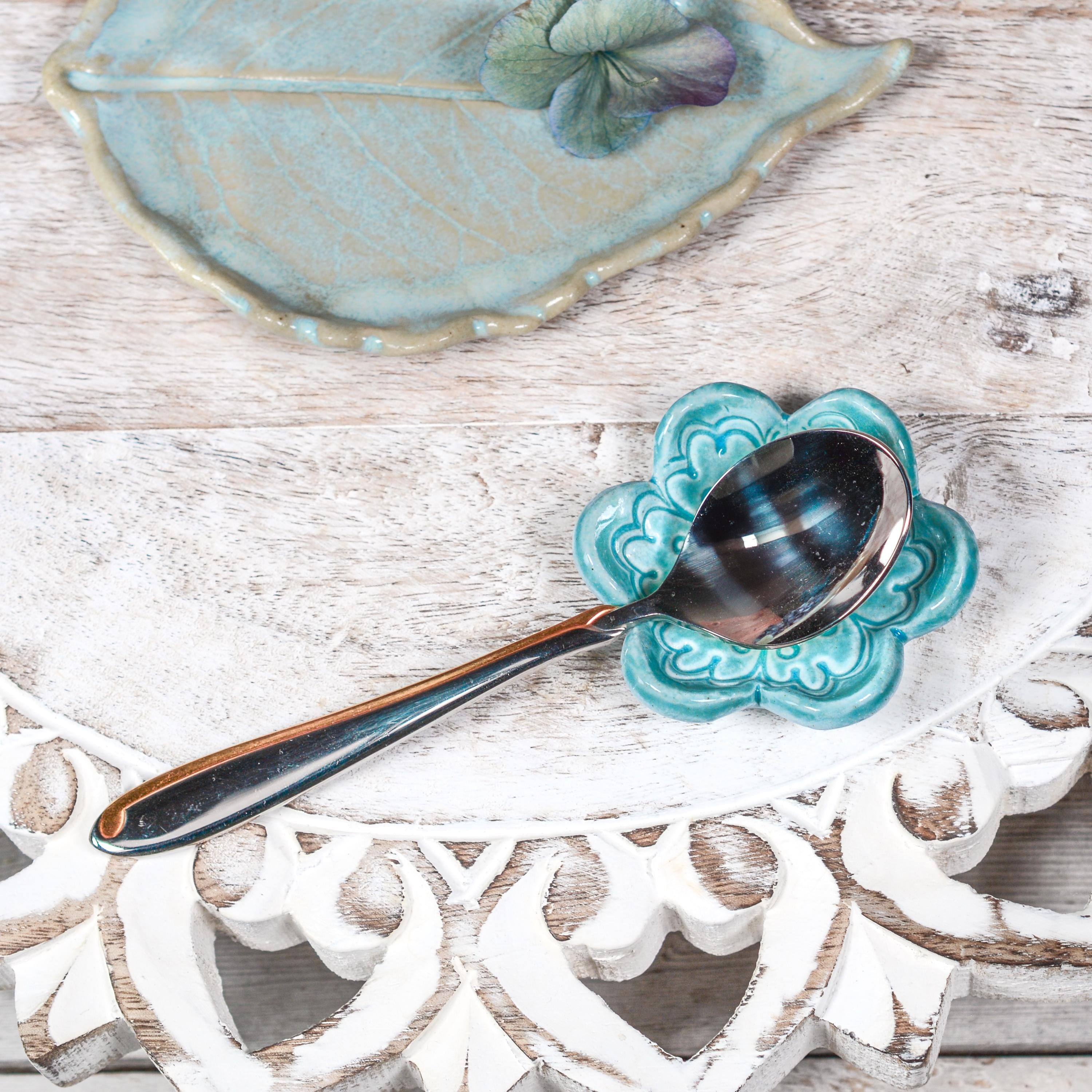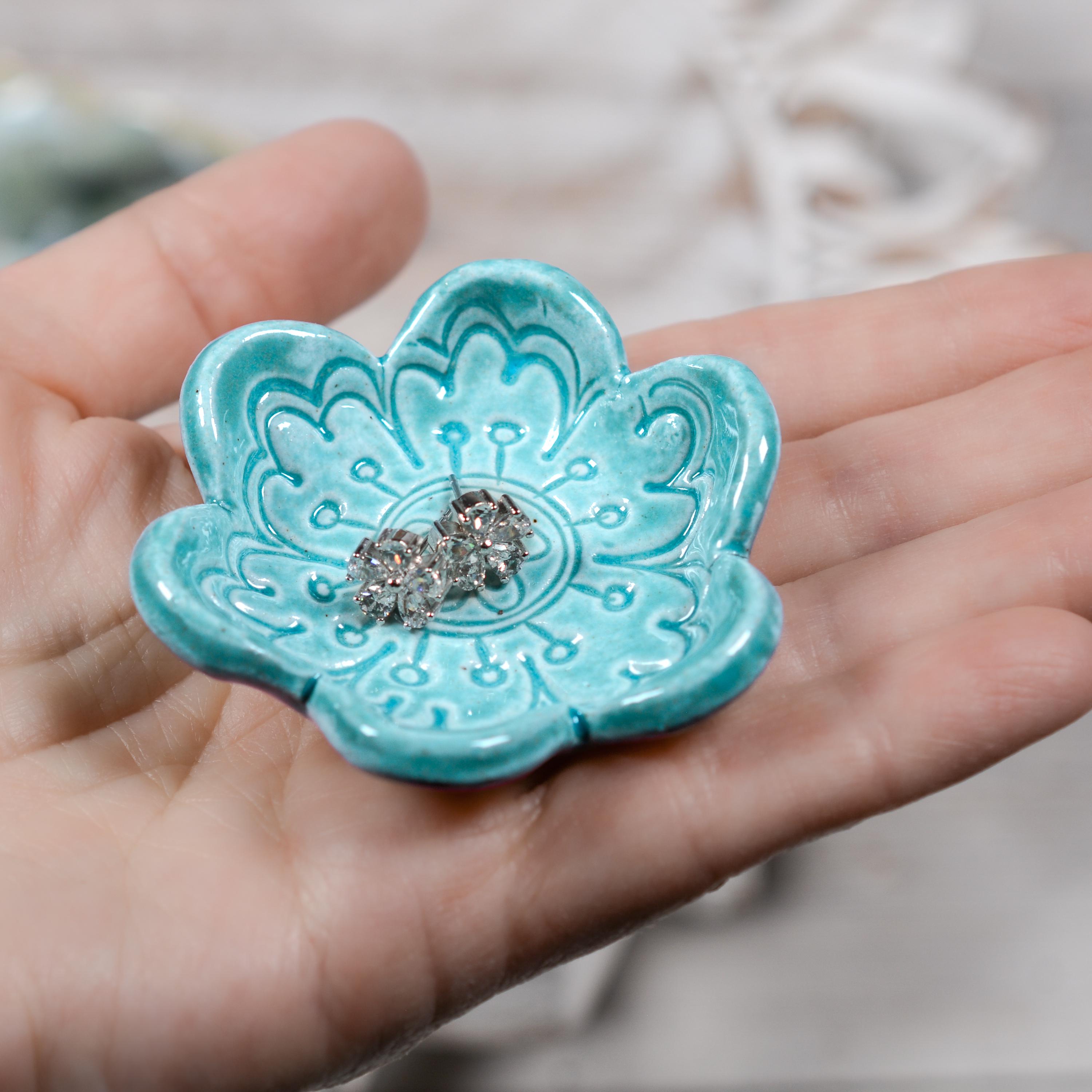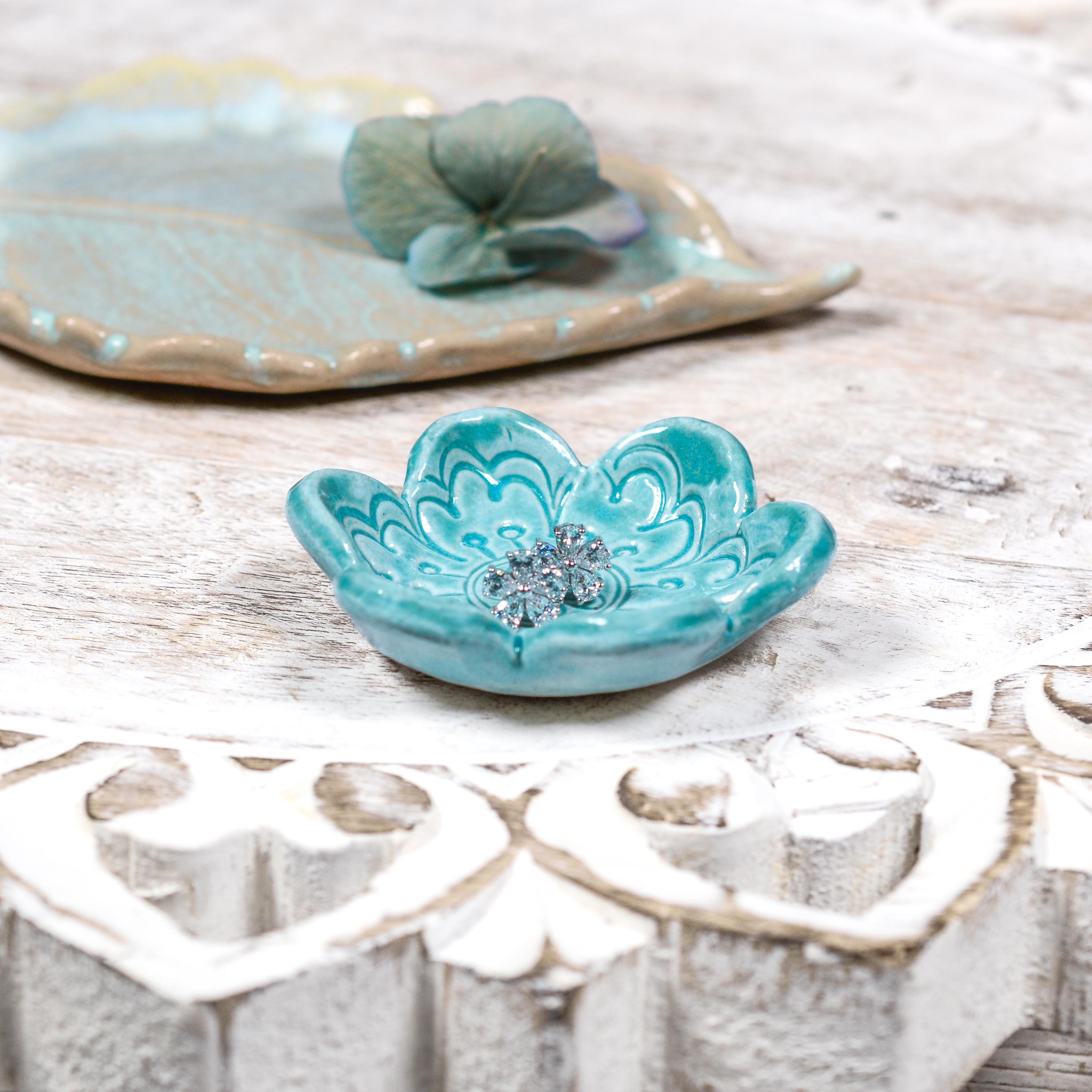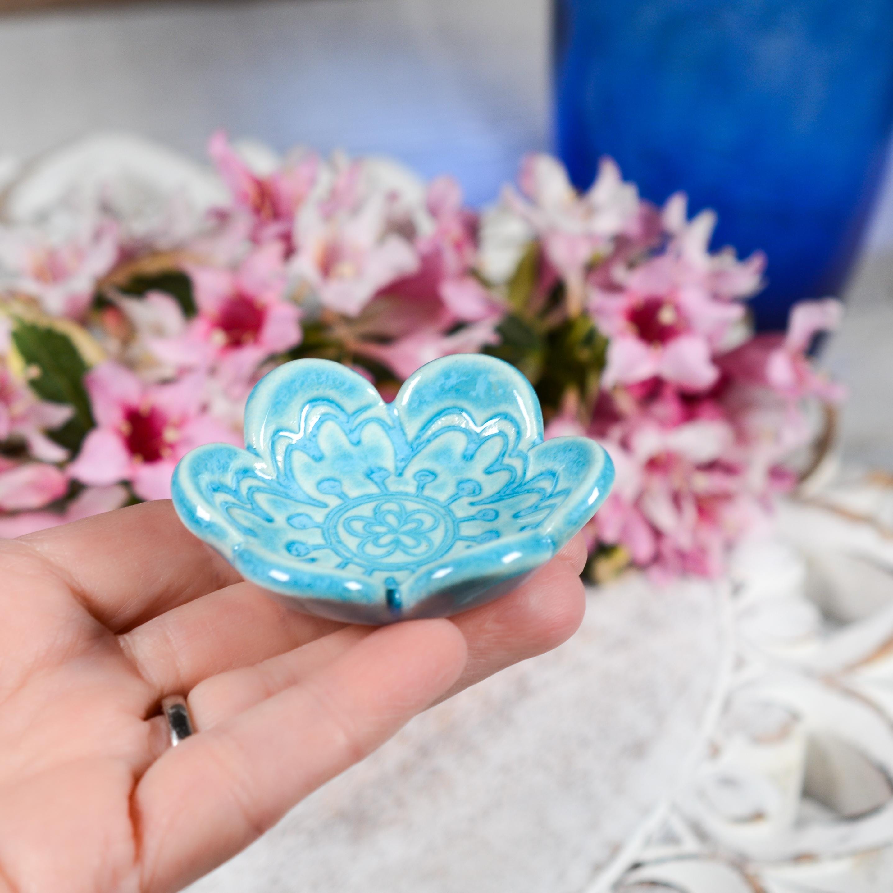 A sweet little flower shaped dish for earrings, pills, or any little item. Use as a jewelry dish or tiny teaspoon rest.