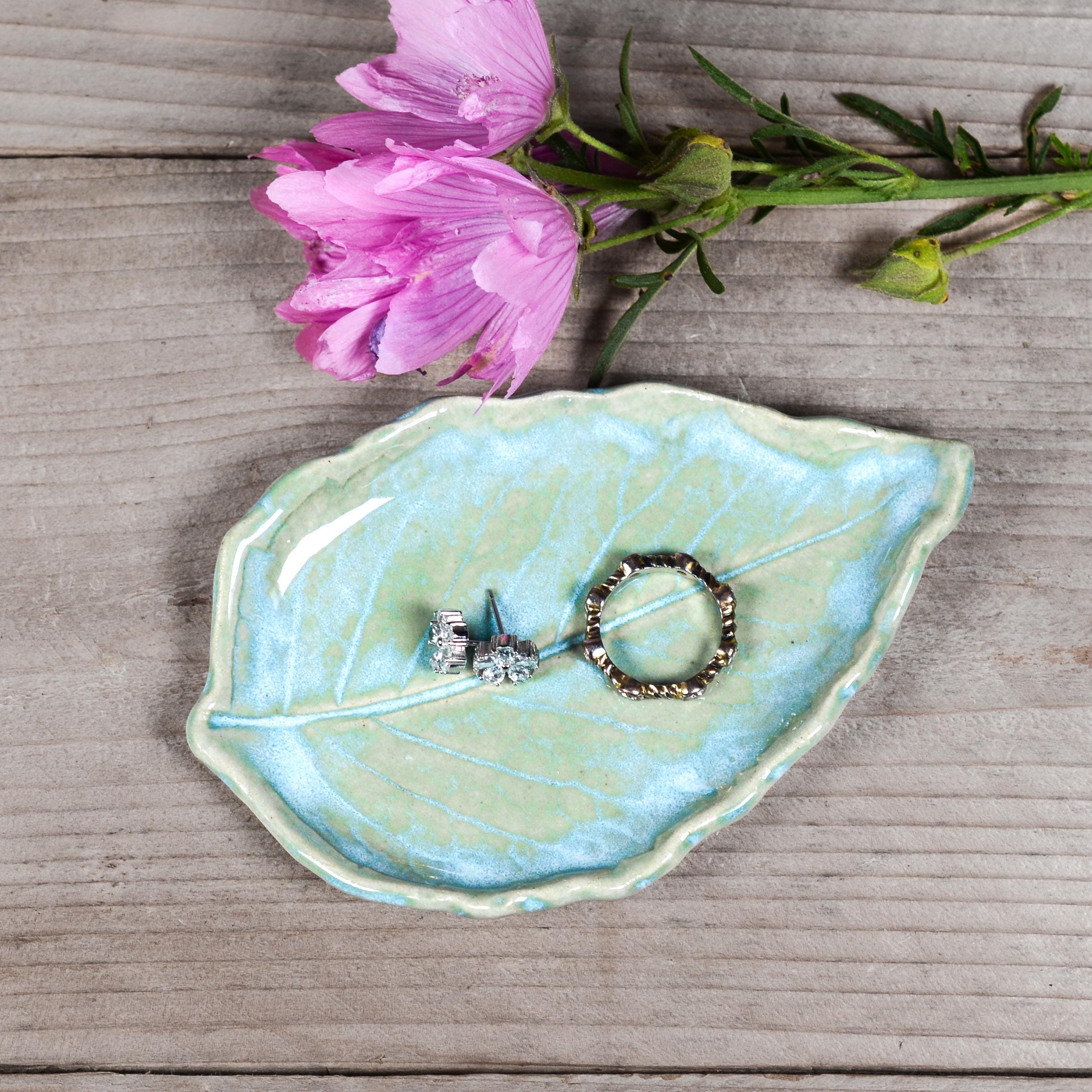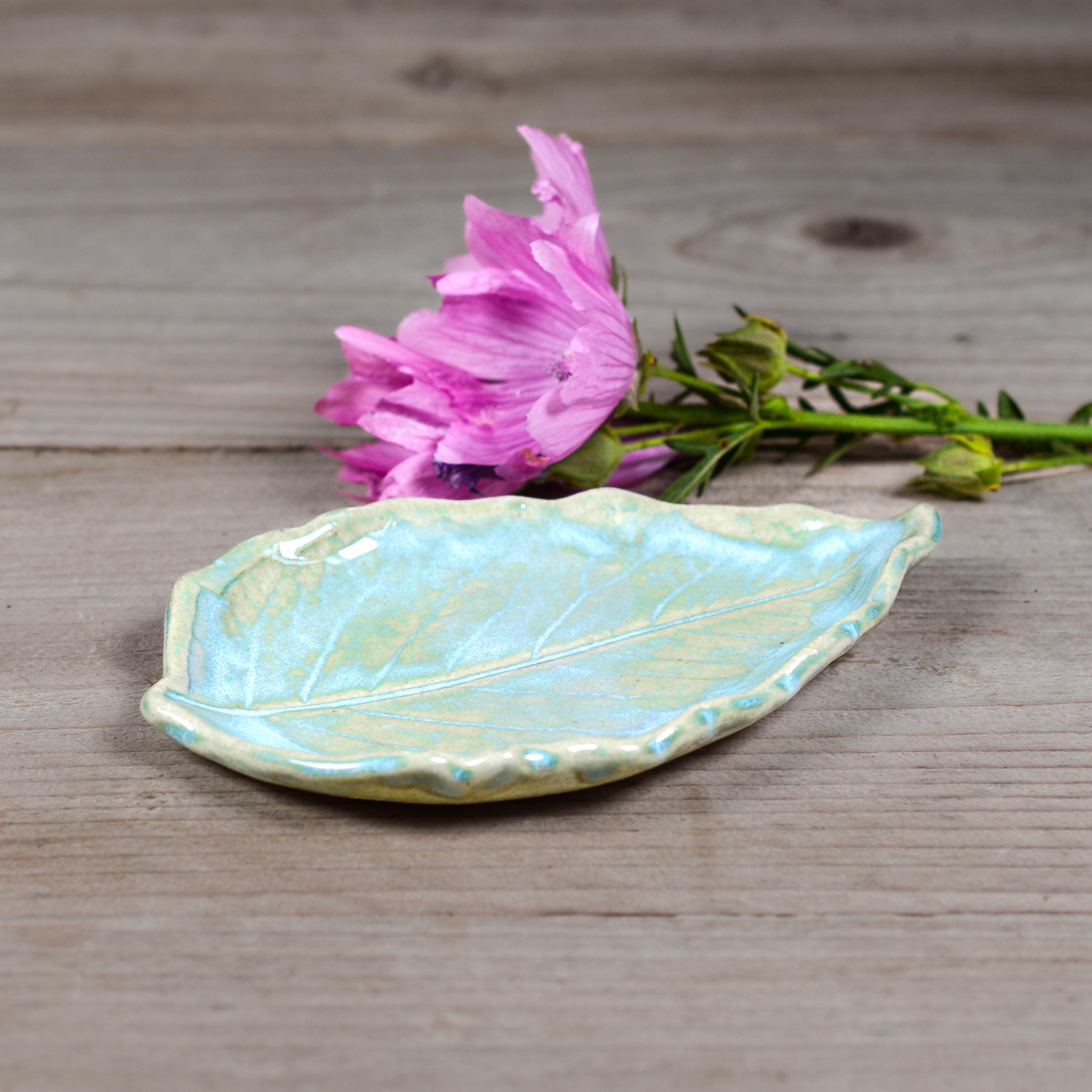 A little piece of art, made from a dahlia leaf. Glazed with layers of transparent aqua blue glaze.