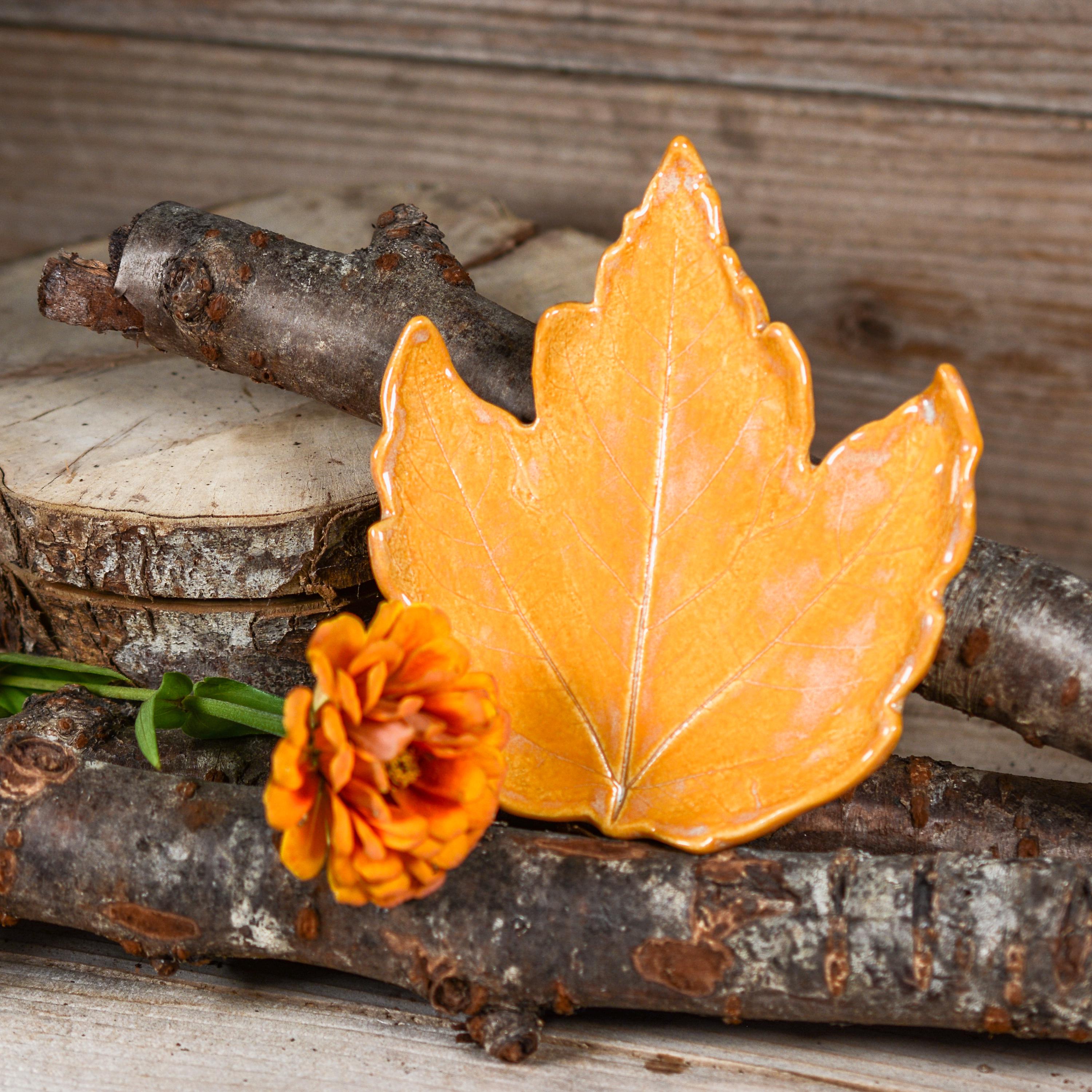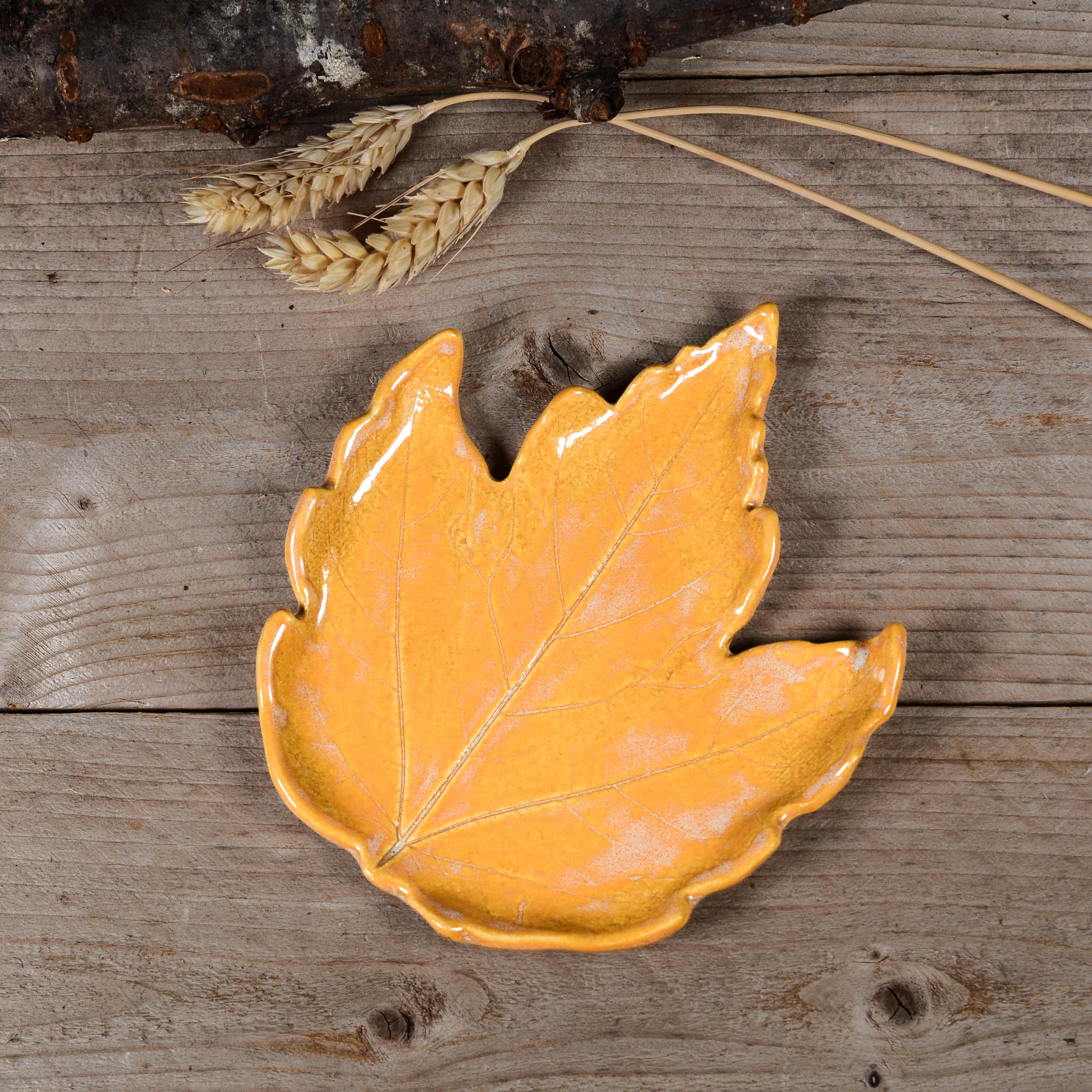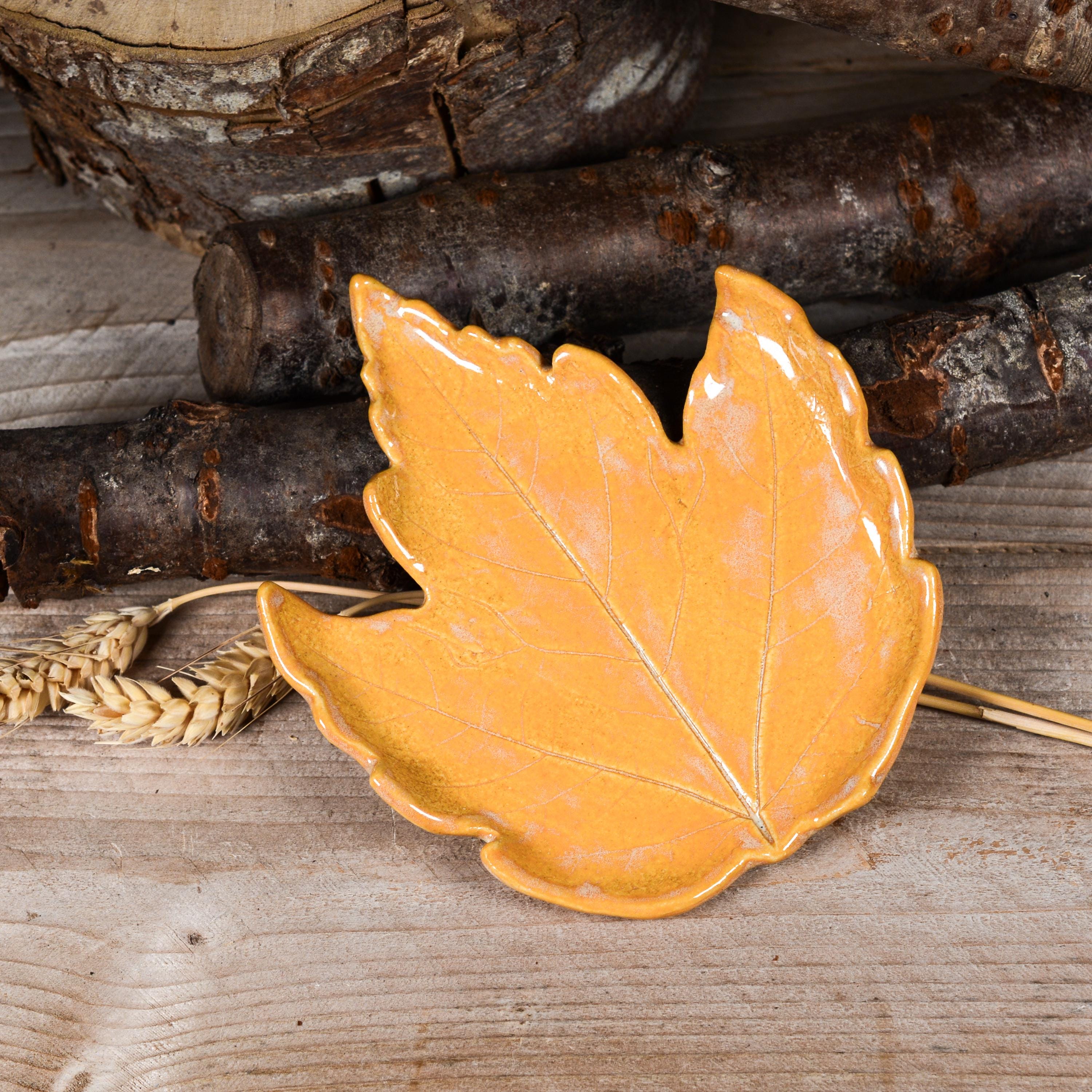 Brighten up your home with this colorful maple leaf that can be used as a spoon rest, soap dish, jewelry dish and more. Glazed in layers of bright yellow orange that reminds me of a the inside of a pumpkin.