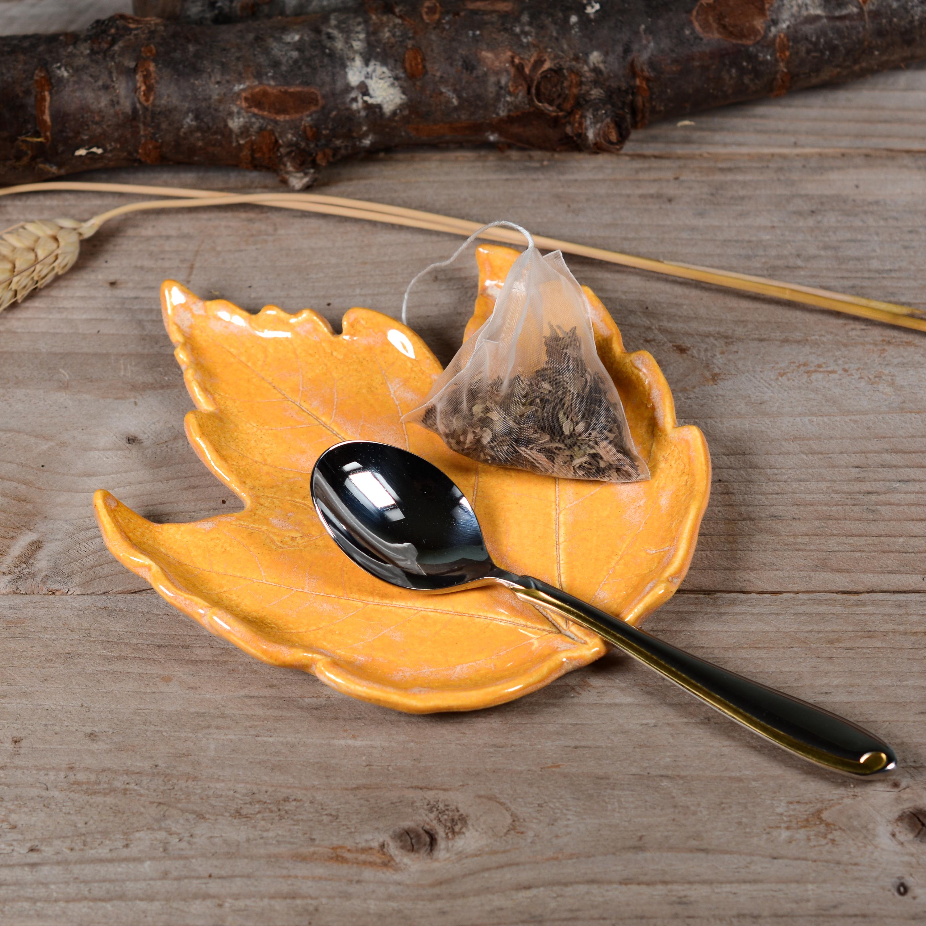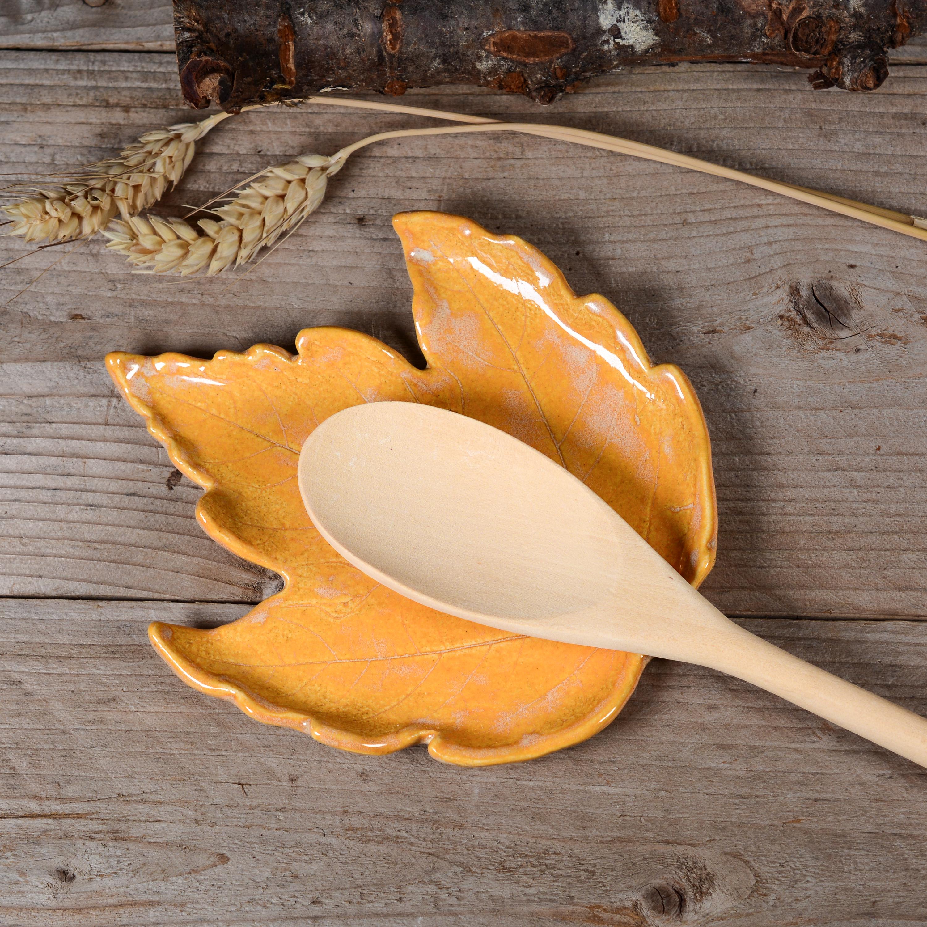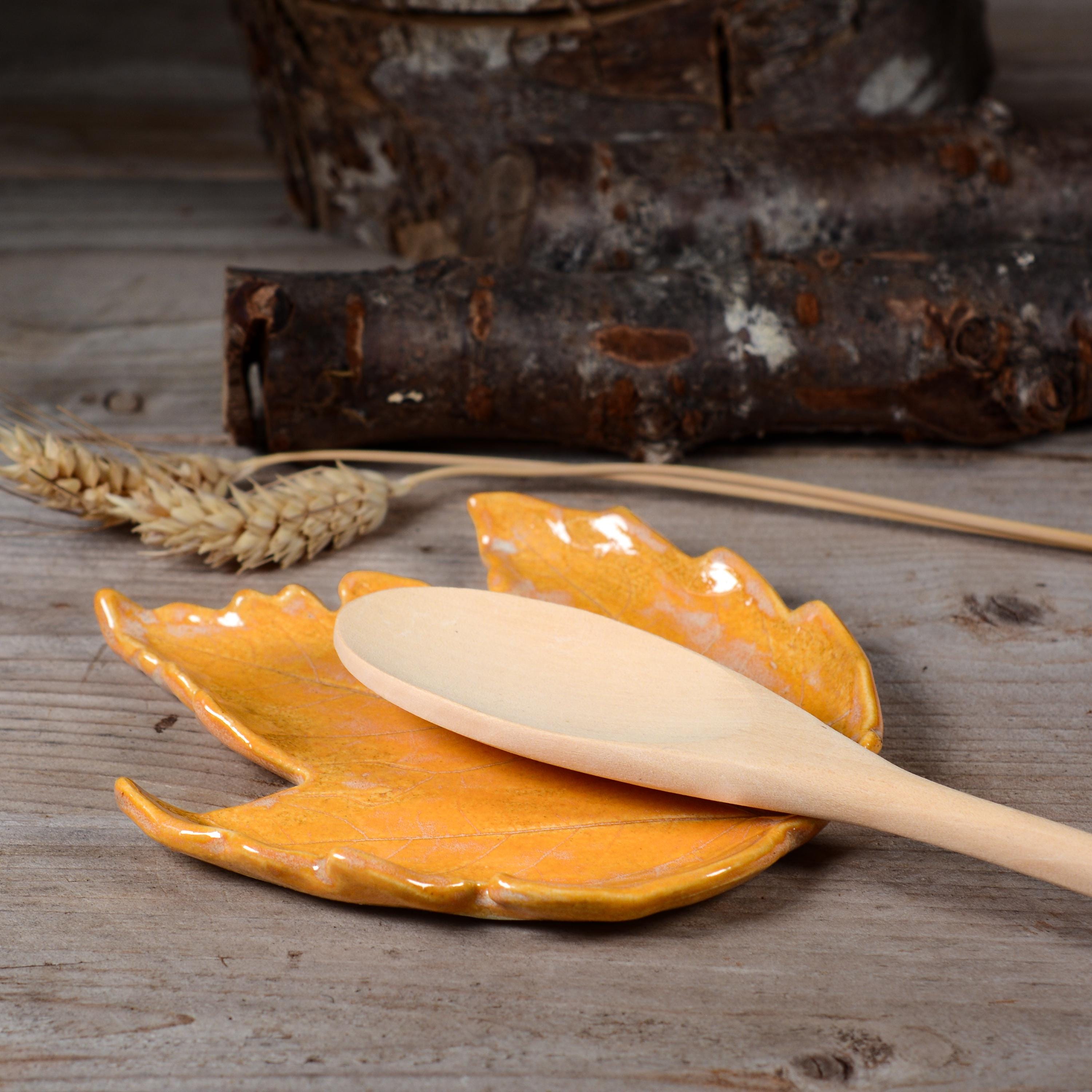 Brighten up your home with this colorful maple leaf that can be used as a spoon rest, soap dish, jewelry dish and more. Glazed in layers of bright yellow orange that reminds me of a the inside of a pumpkin.