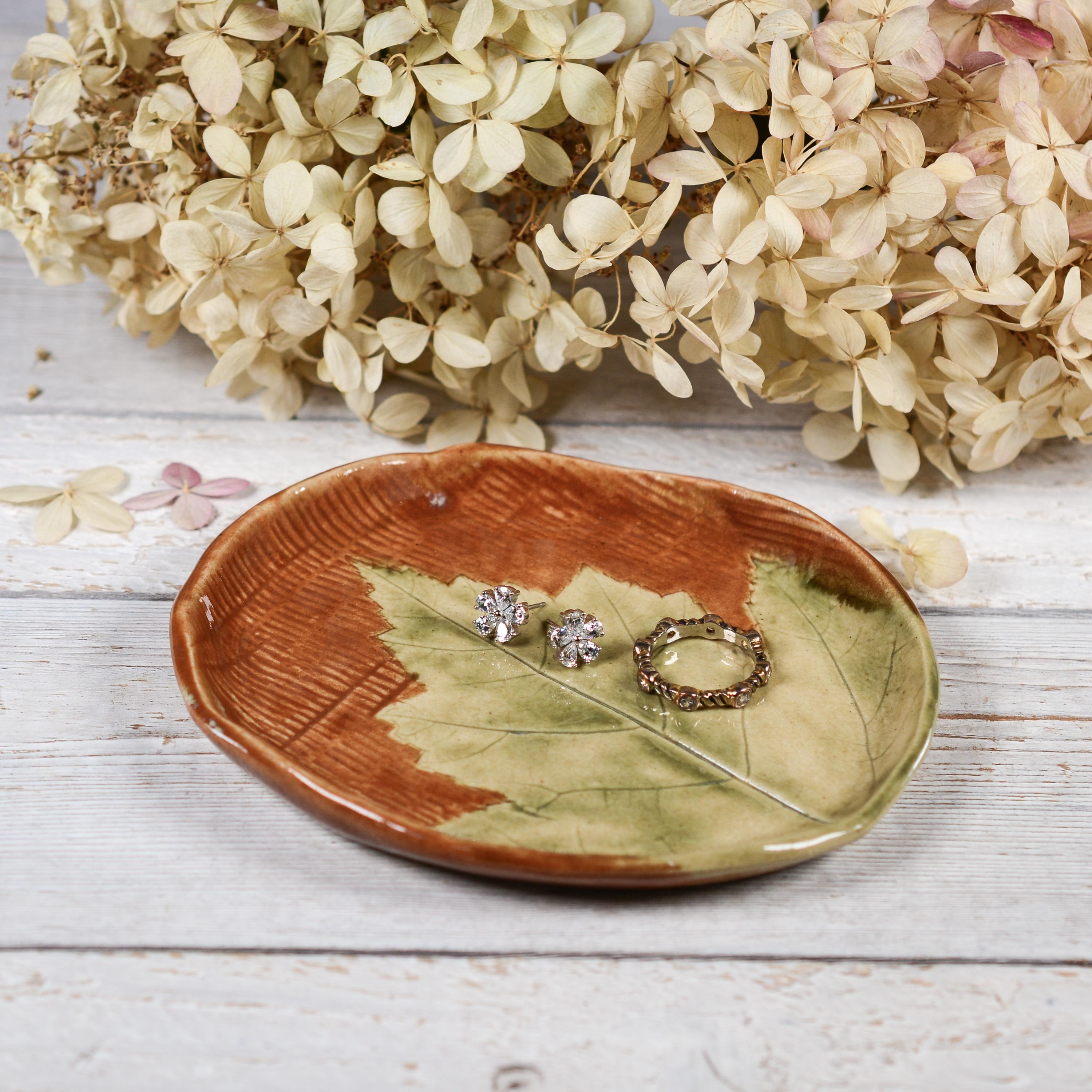 A hand formed ceramic dish, glazed in earthy orange with a soft green maple leaf design.