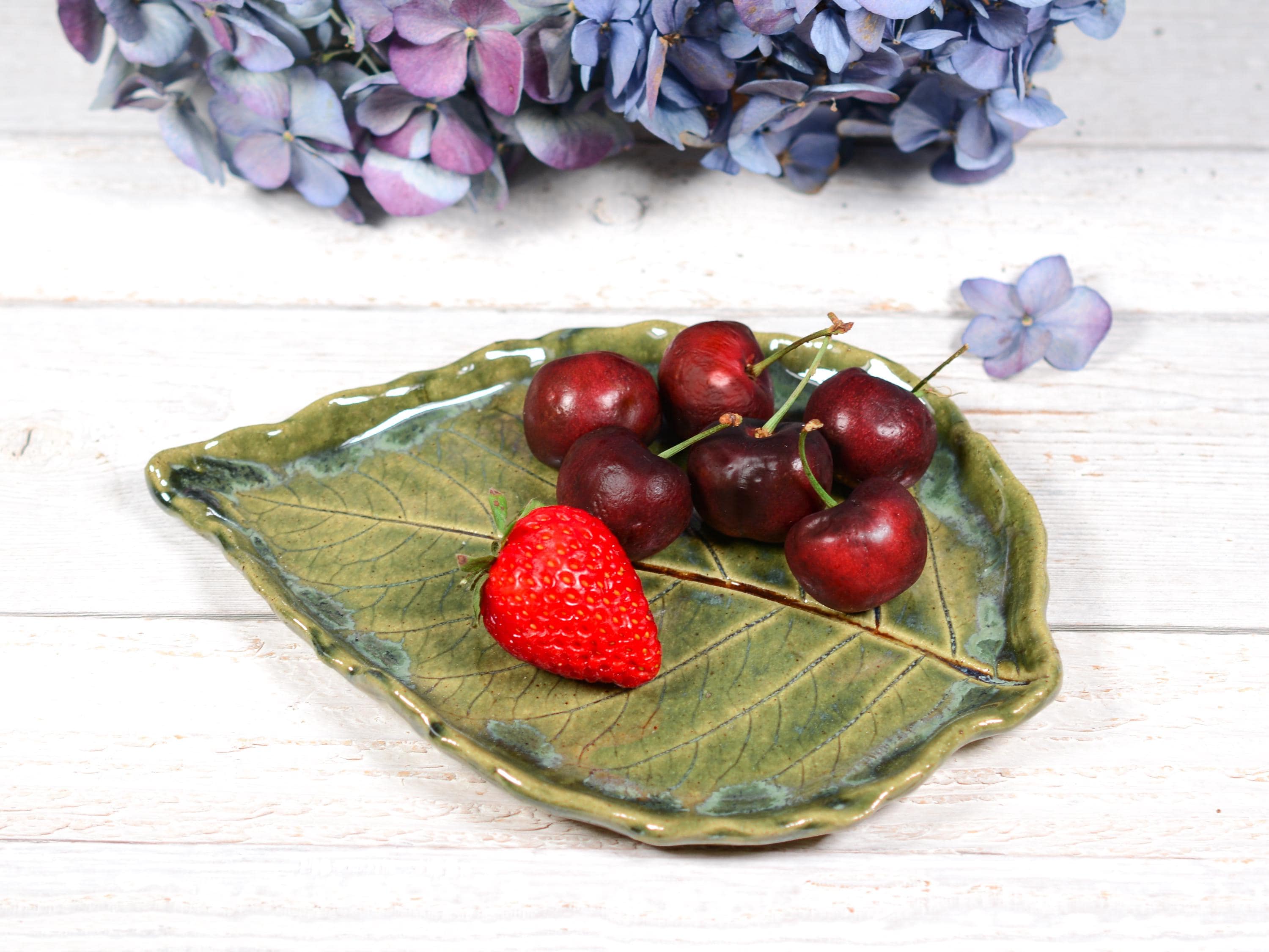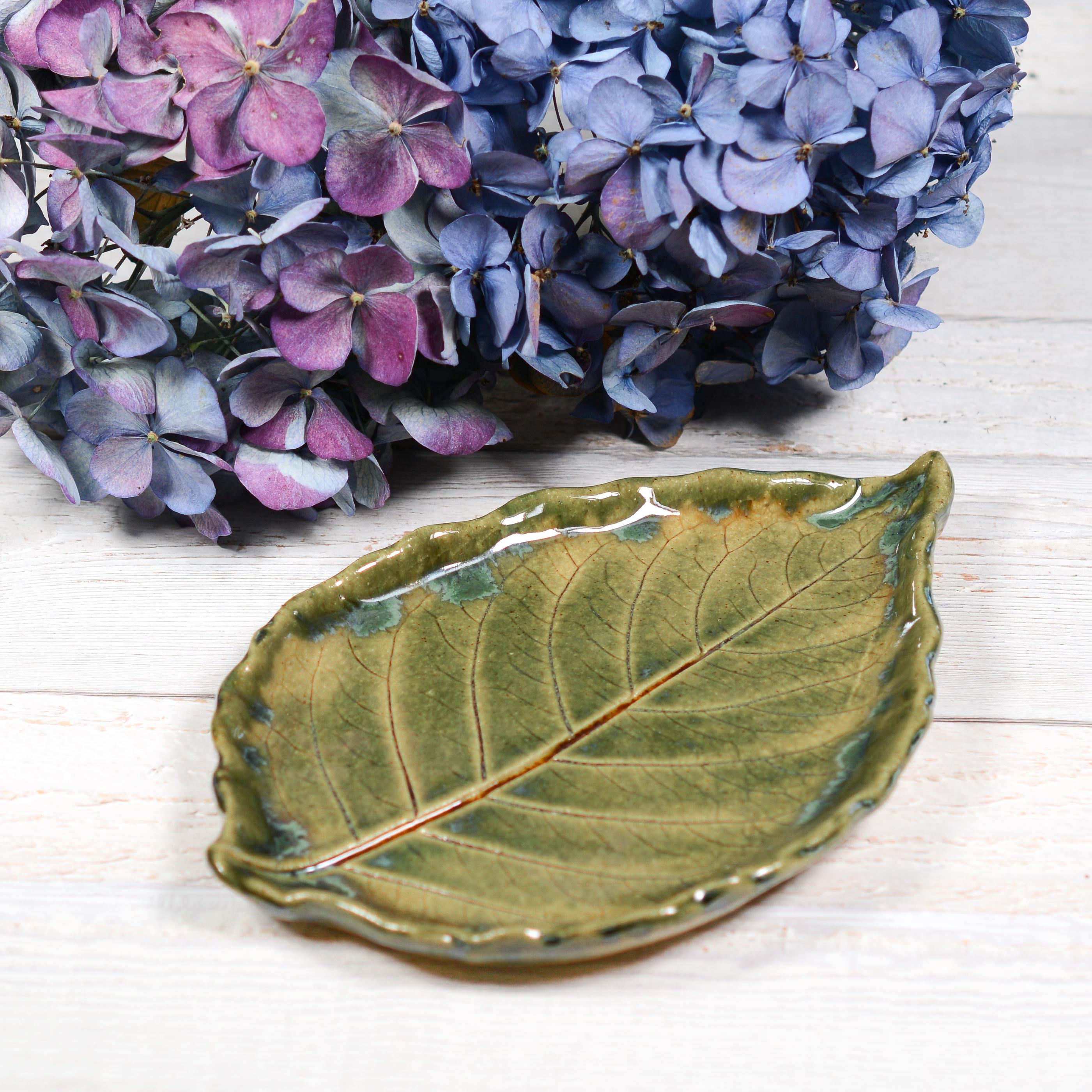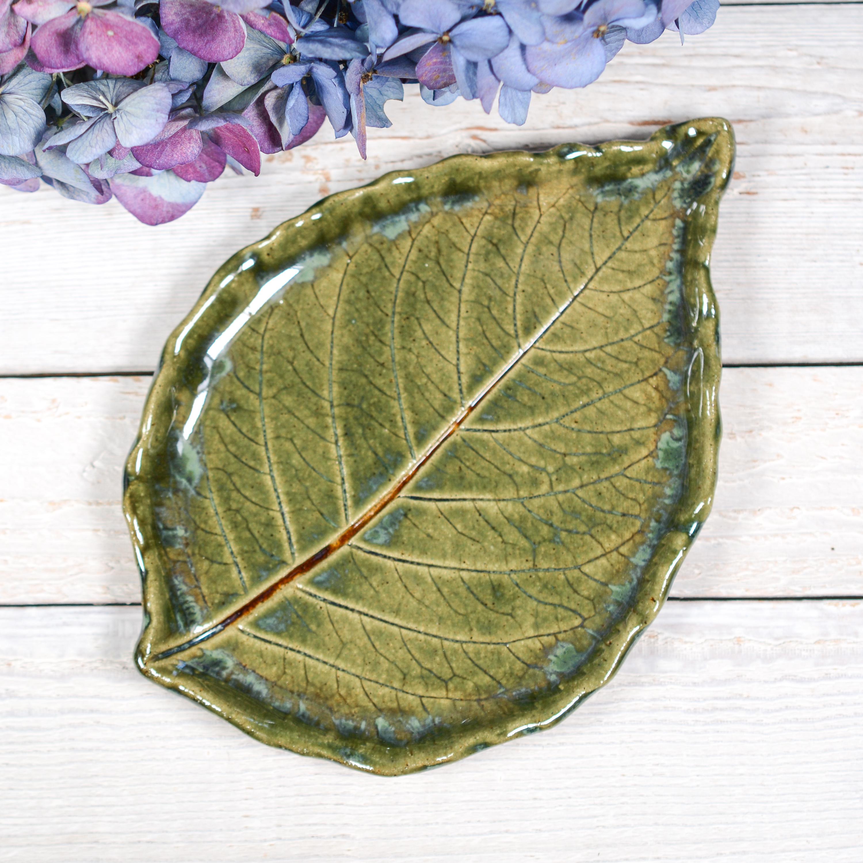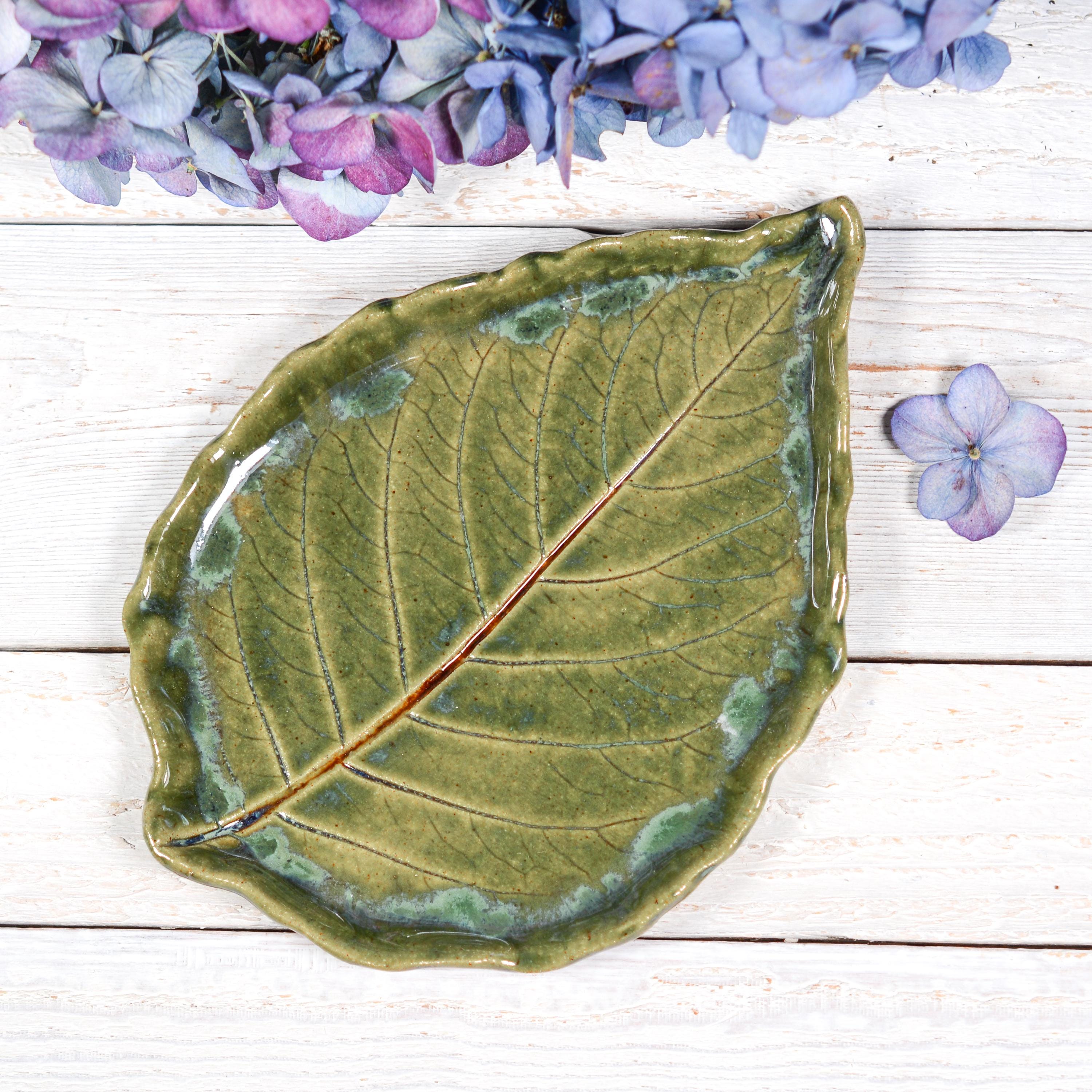 HANDMADE by me with Washington clay and food safe glazes from the largest hydrangea leaves I could find in my garden. High fired stoneware clay chip resistant. Nicely finished with attention to detail.