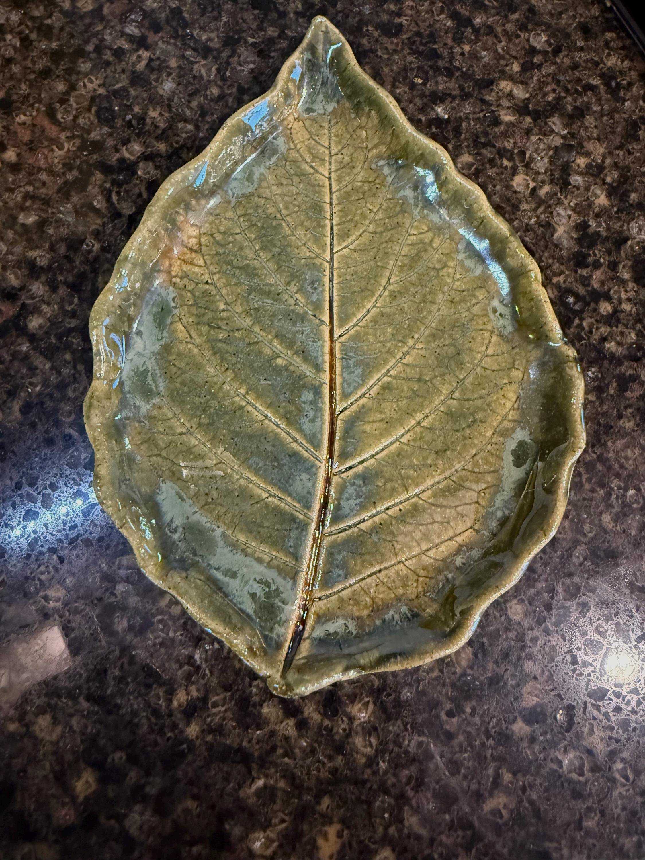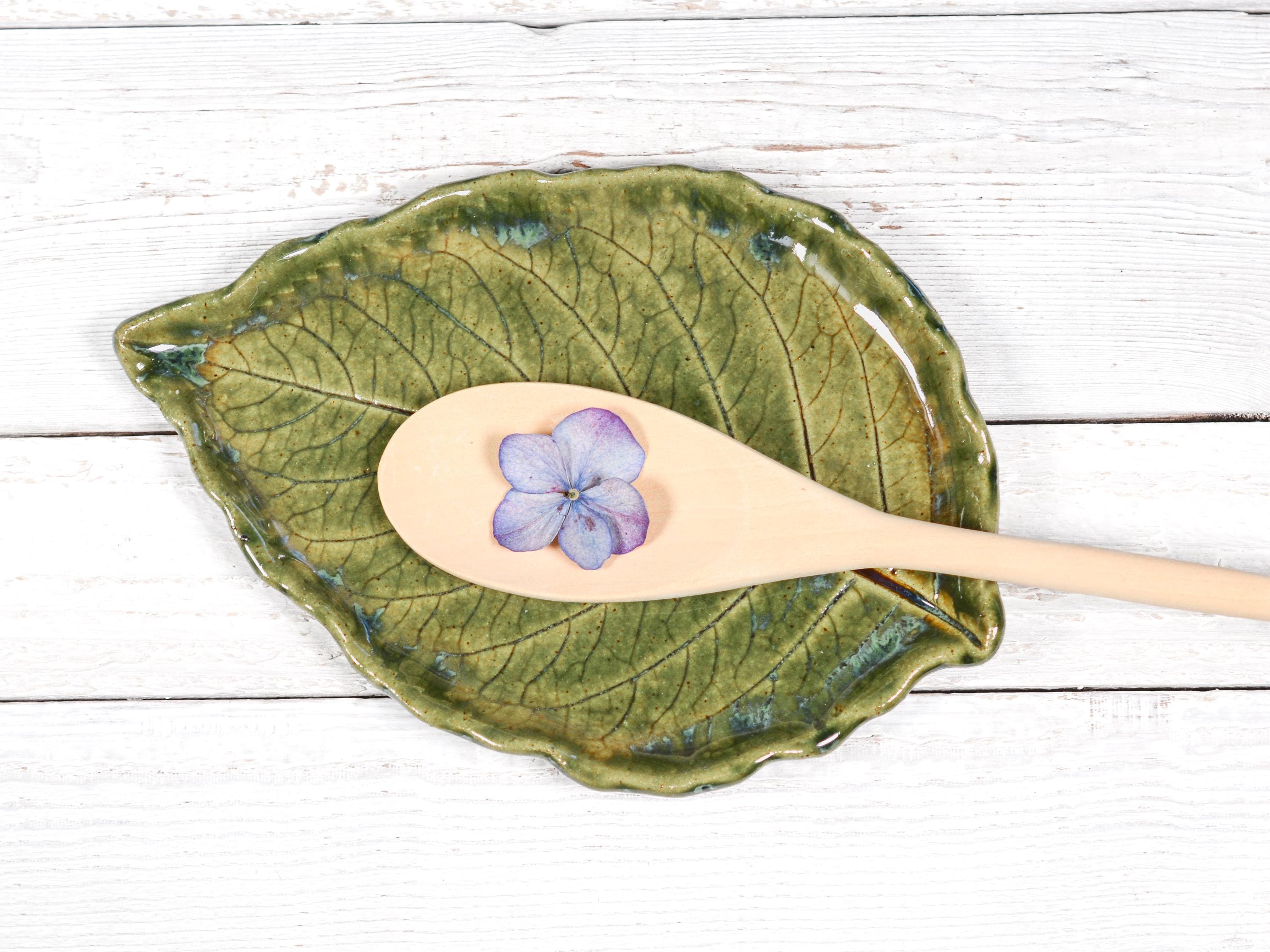 This ceramic leaf is a nice size to use as an extra large spoon rest or appetizer/snack plate.