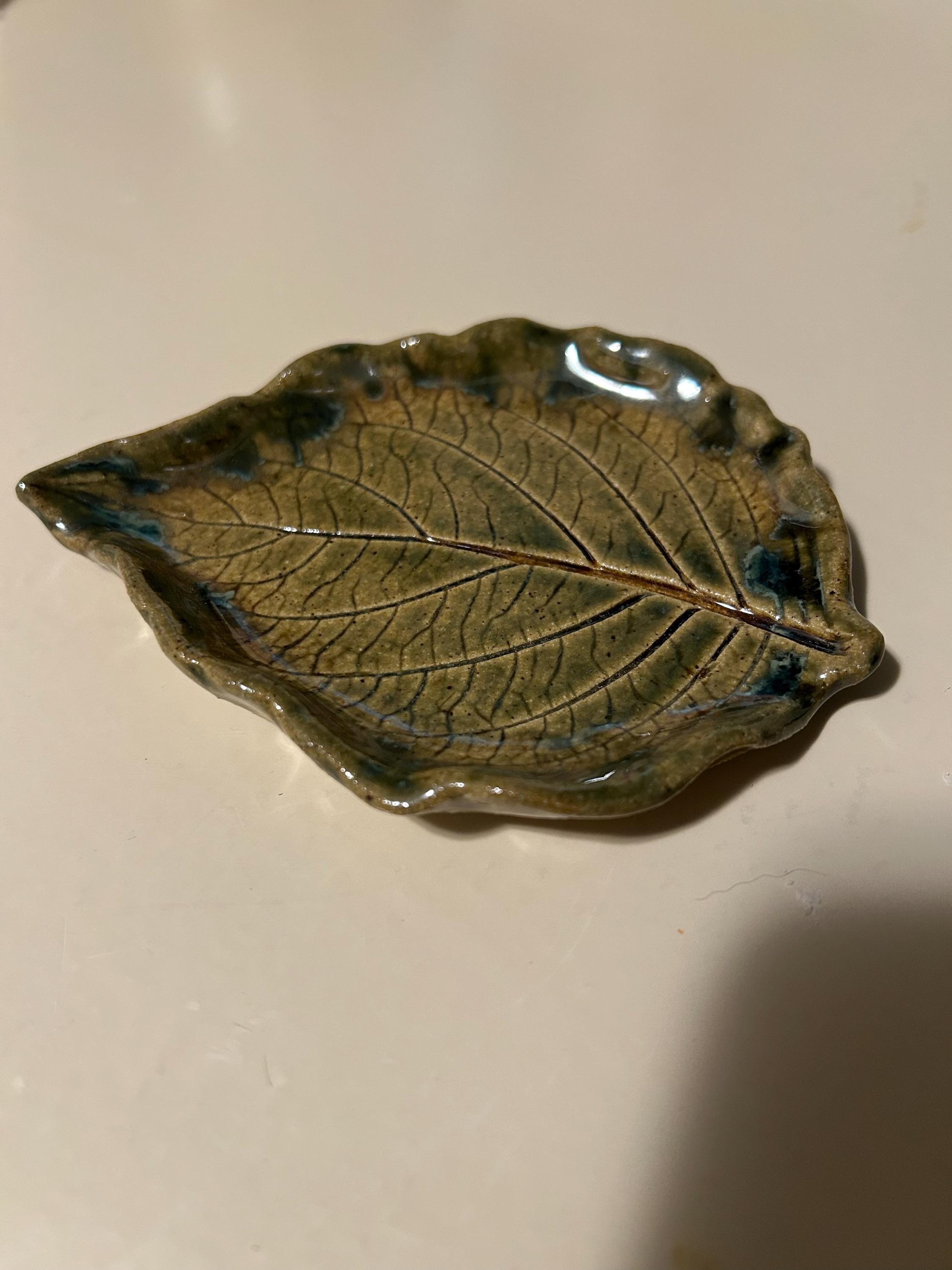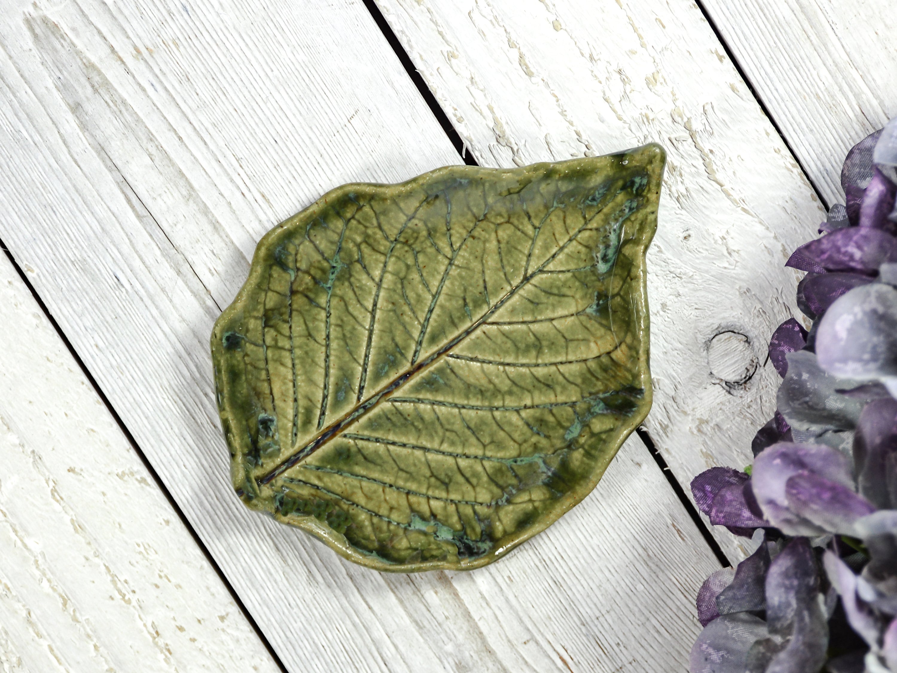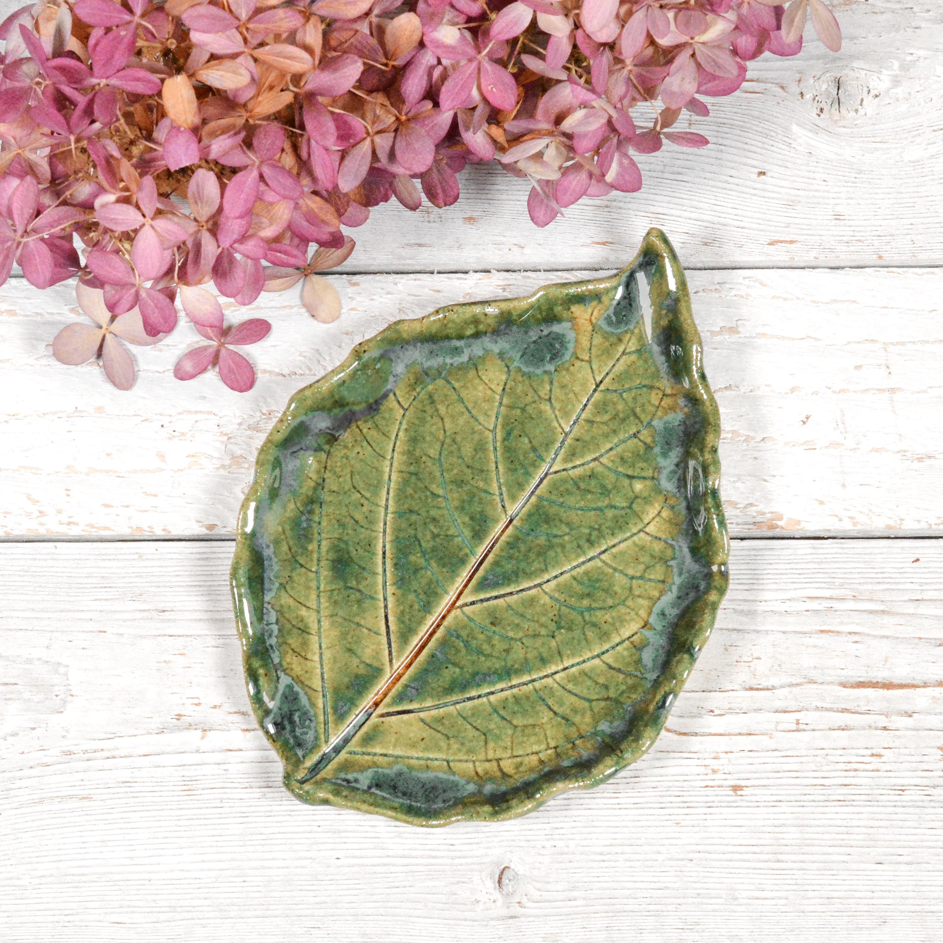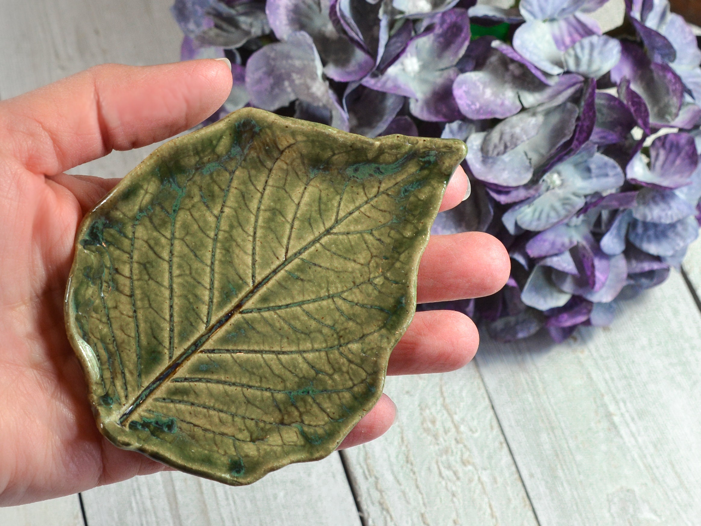 HANDMADE with Washington clay and food safe glazes from a hydrangea leaf out of my garden.