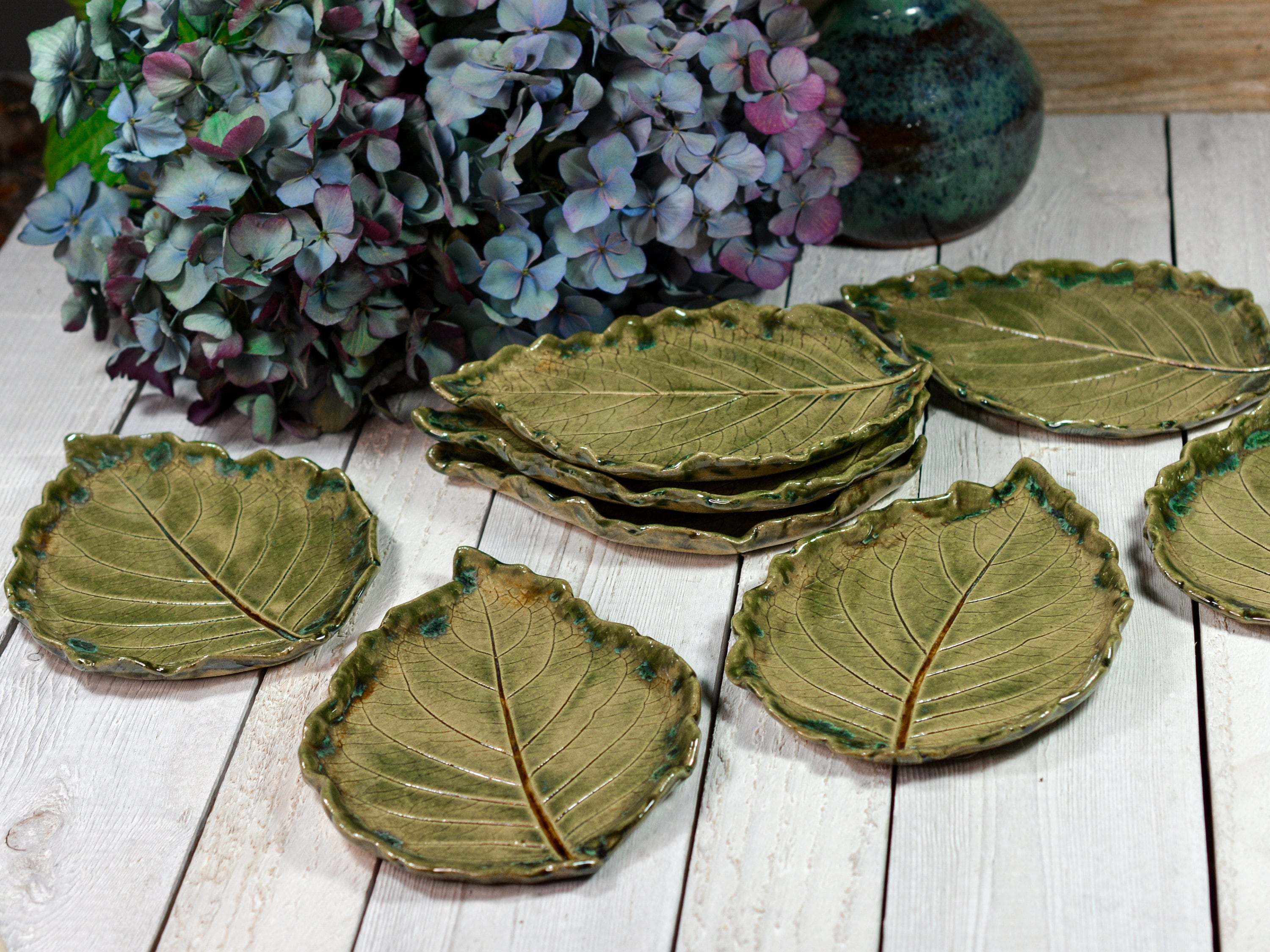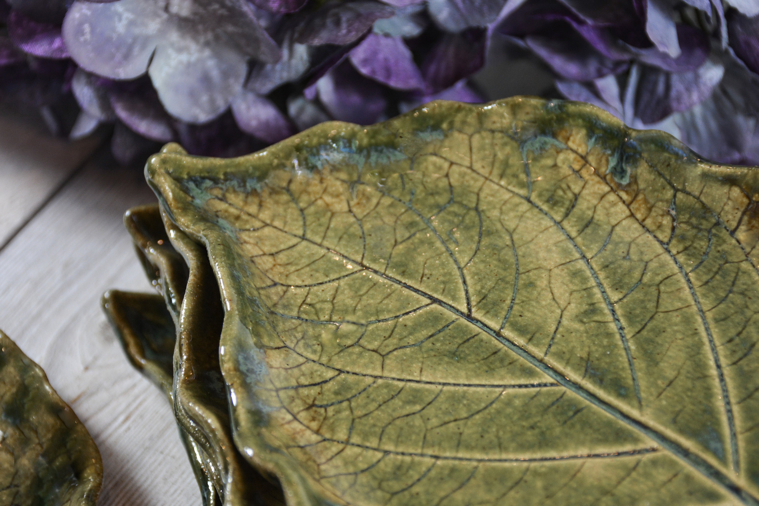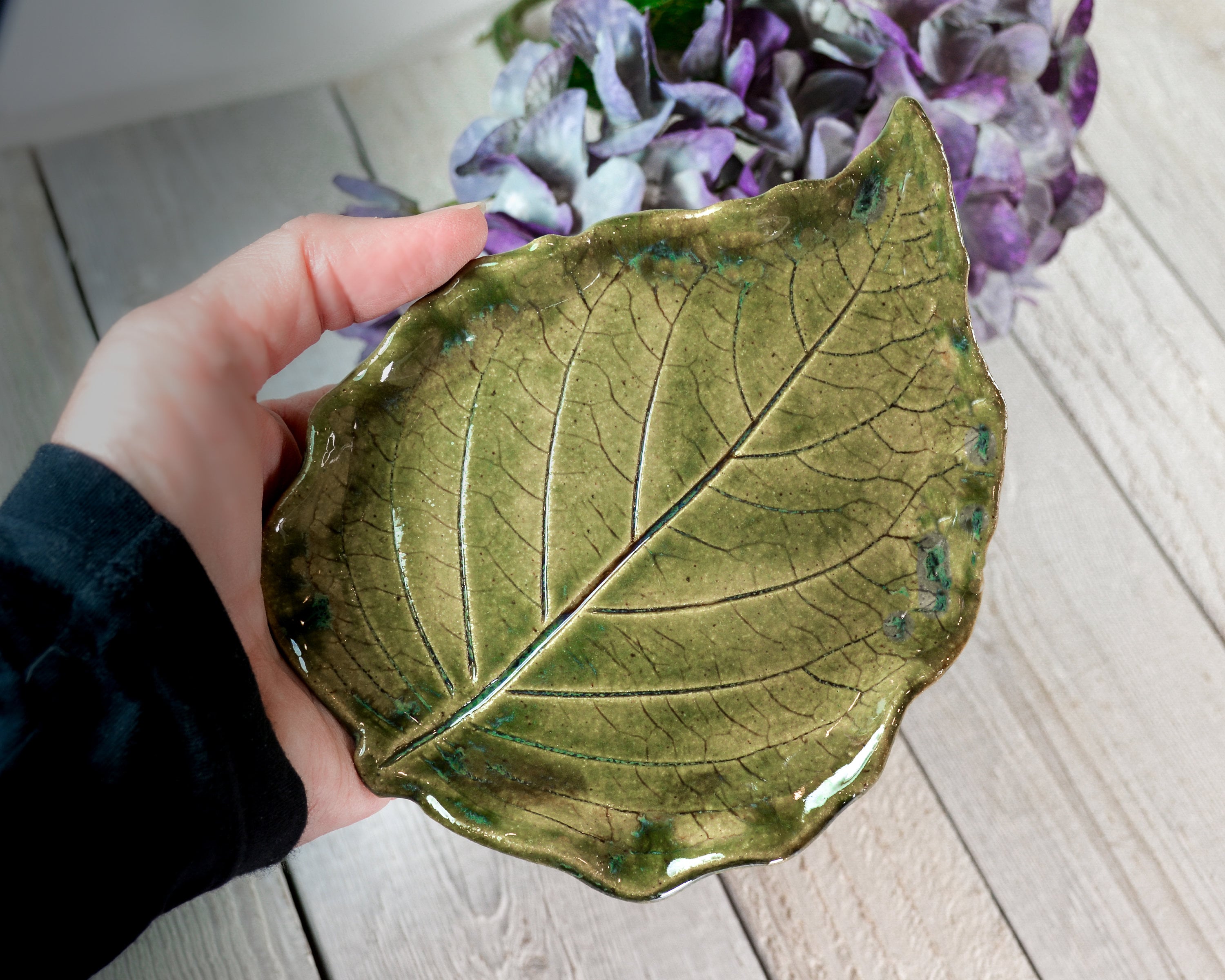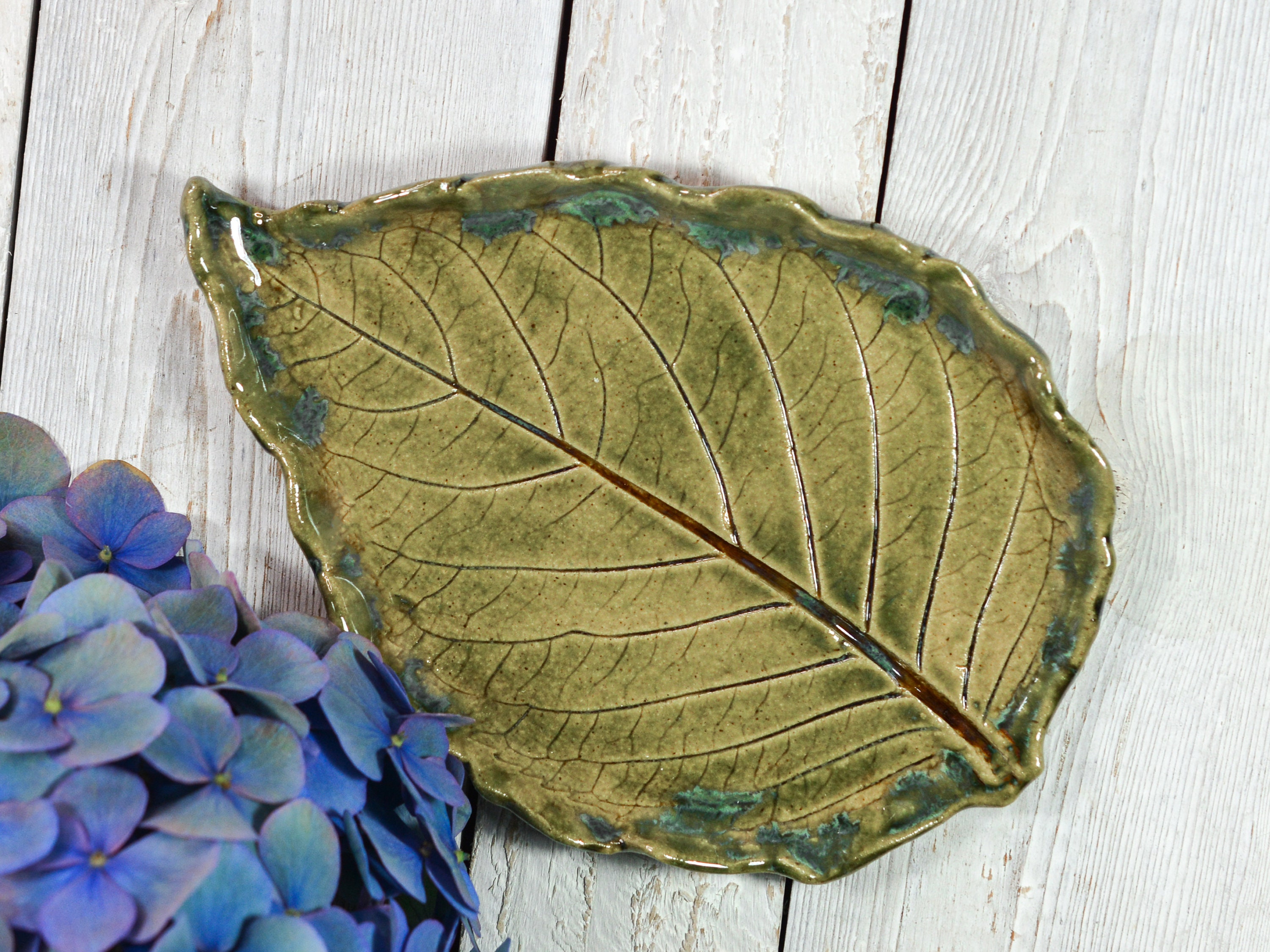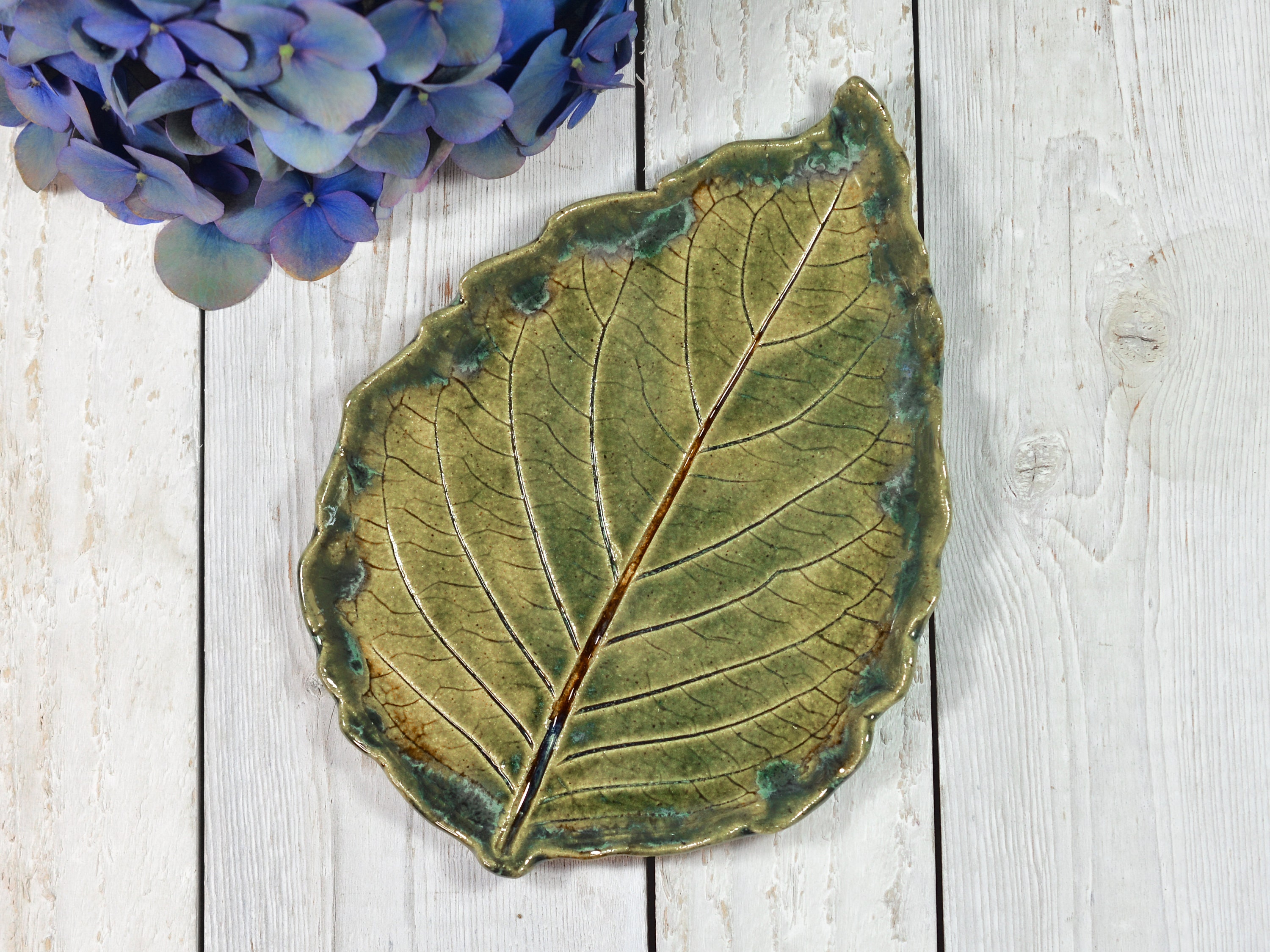 HANDMADE with Washington clay and food safe glazes from a hydrangea leaf out of my garden.